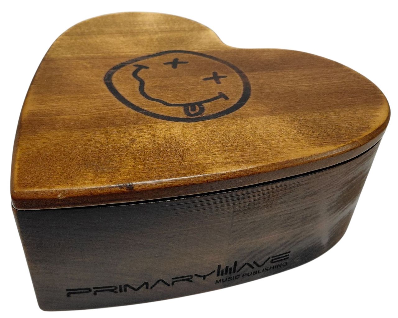 NIRVANA The Songs Of Kurt Cobain (Mega rare official 2007 US limited-edition, promotional-only Five CD box set, produced to promote licensing interest in Kurt's extensive back catalogue, acquired by Primary Wave Publishing from Courtney Love in early 2007. Each custom-printed picture Disc is housed within a beautiful heart-shaped, hand-carved wooden musical box with Kurt's caricature logo etched on the lid and Primary Wave's logo on the side. When the lid is removed you are greeted by the intro bars of Heart-Shaped Box, and treated to a booklet and individually numbered certificate. This fantastic item has quickly become THE rarity to own and covet.Please see Tracklisting / Additional Information for more details)