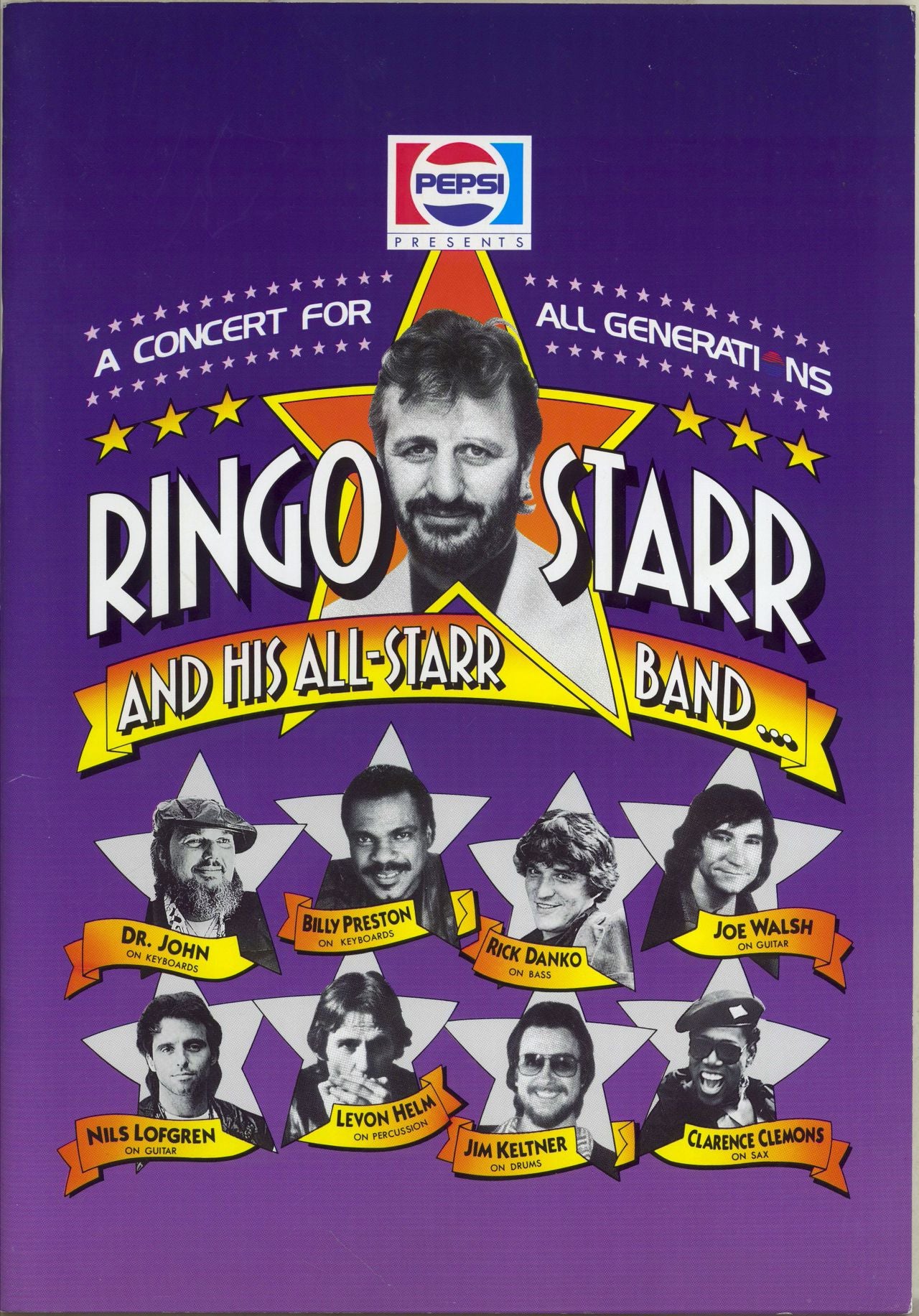 RINGO STARR All-Starr Band Tour (1989 Japanese Pepsi sponsored oversize 36-page glossy 'A Concert For All Generations' tour programme including an array of full colour photos or Ringo plus individual profile pages for the band members including Dr. John, Joe Walsh and Blly preston, also includes biography, song list, personnel page, tour dates and adverts. The sleeve is showing light evidence of storage but overall remains in great shape, and includes a ticket stub for the 6th & 7th November shows at the Nippon Budokan in Tokyo)