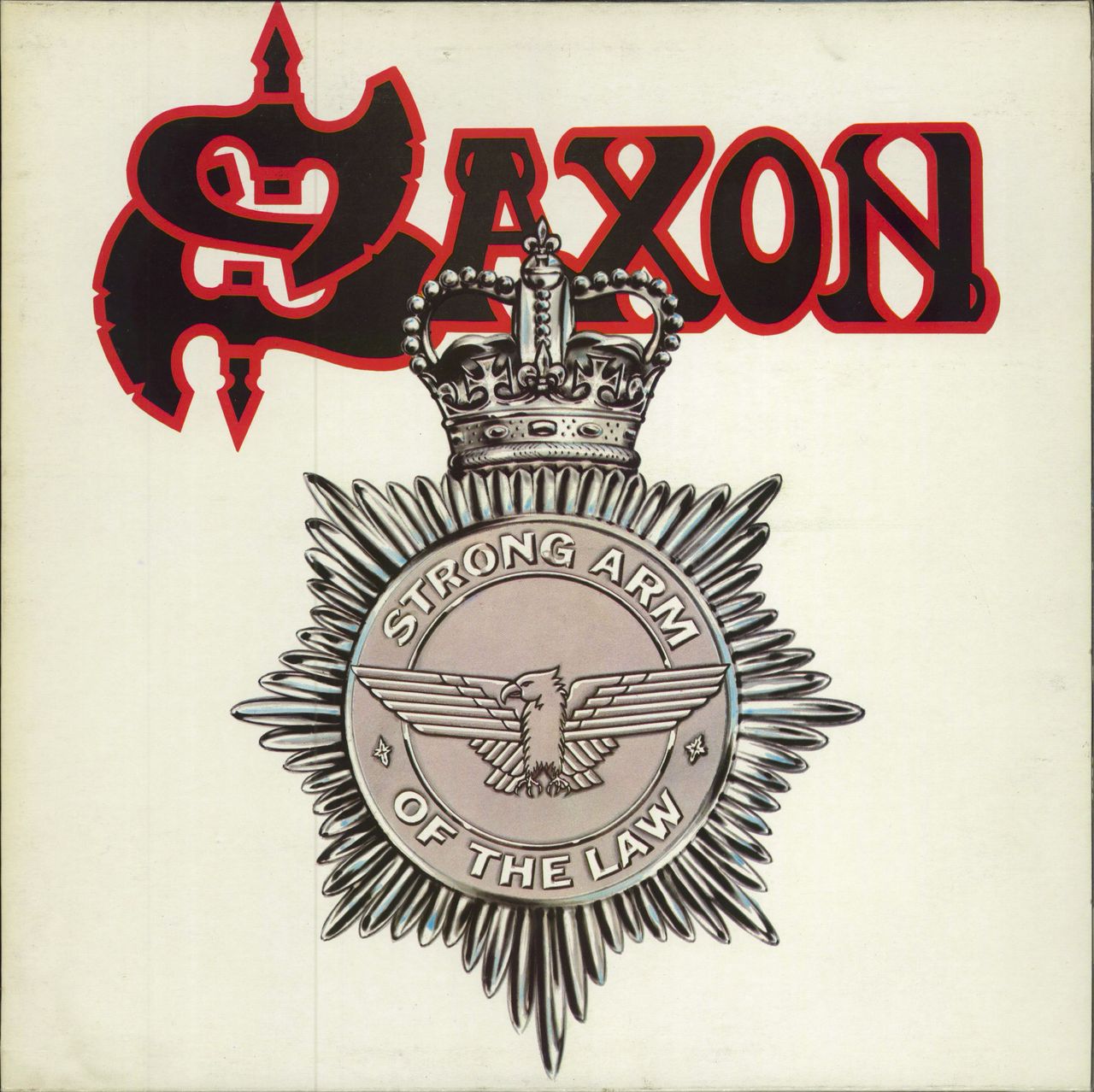 SAXON Strong Arm Of The Law (1980 UK limited edition 8-track LP, including Hungry Years and Heavy Metal Thunder, picture sleeve complete with the hard to find bonus 9" square crackback stick & sew patch. The sleeve shows some storage wear and a small split at the top of the sleeve. The vinyl has a few hairlines but nothing to affect play! CAL120)
