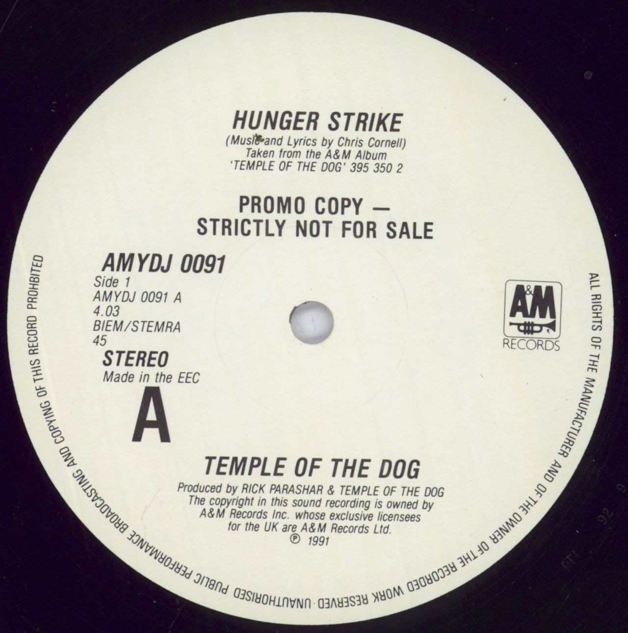TEMPLE OF THE DOG Hunger Strike (Rare 1991 UK 3-track white title label promotional vinyl 12",also including Your Saviour and All Night Thing, plain die-cut card sleeve. The vinyl shows very little evidence of play, and remains a really nice example AMYDJ0091)