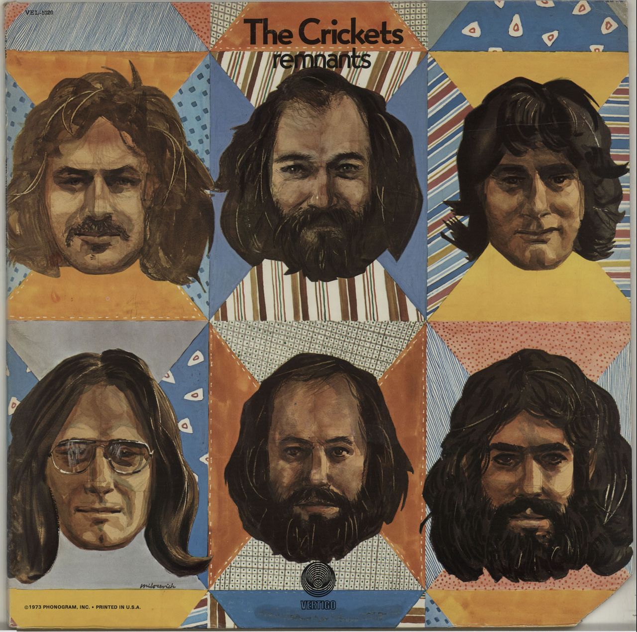 THE CRICKETS Remnants (1973 US 12-track vinyl LP on the spaceship Vertigo label, with Albert Lee, Sonny Curtis and Rick Grech, pasted picture sleeve with deletion corner clip and original Mercury/Vertigo catalogue inner. The sleeve shows minimalwear and the vinyl appears barely played VEL-1020)