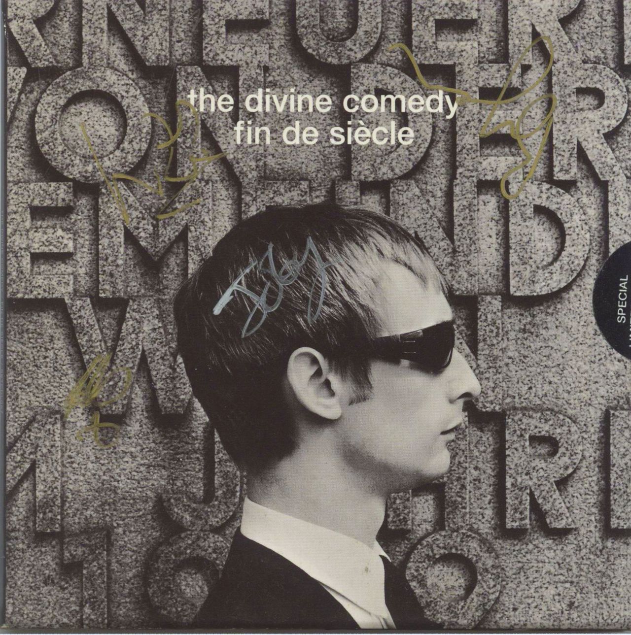 THE DIVINE COMEDY Fin De Siecle (Fully Autographed 1998 UK limited edition 10-track CD guest starring Dexter Fletcher, housed in a gatefold pocket picture sleeve with an exclusive lyric booklet. The front & back of the card wallet sleeve is signed by seven band members in silver & gold marker pen - Neil Hannon [on the back], Ivor & Joby Talbot, Bryan Mills, Miggy Barradas, Stuart 'Pinkie' Bates & Rob Farrer SETCDL057)