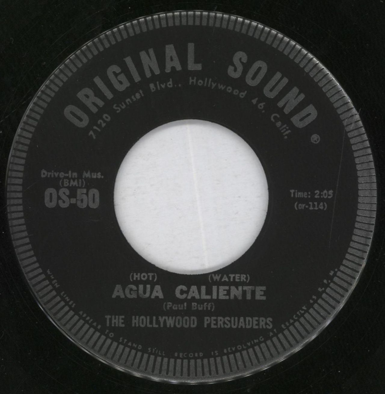 THE HOLLYWOOD PERSUADERS Agua Caliente (Hot Water) (Rare 1965 US Wide centred 7" single, also featuring Drums A-Go-Go, both sides written by Paul Buff and recorded at PAL Studios [later to become Studio Z] in Cucamonga, plain die cut paper sleeve OS-50)