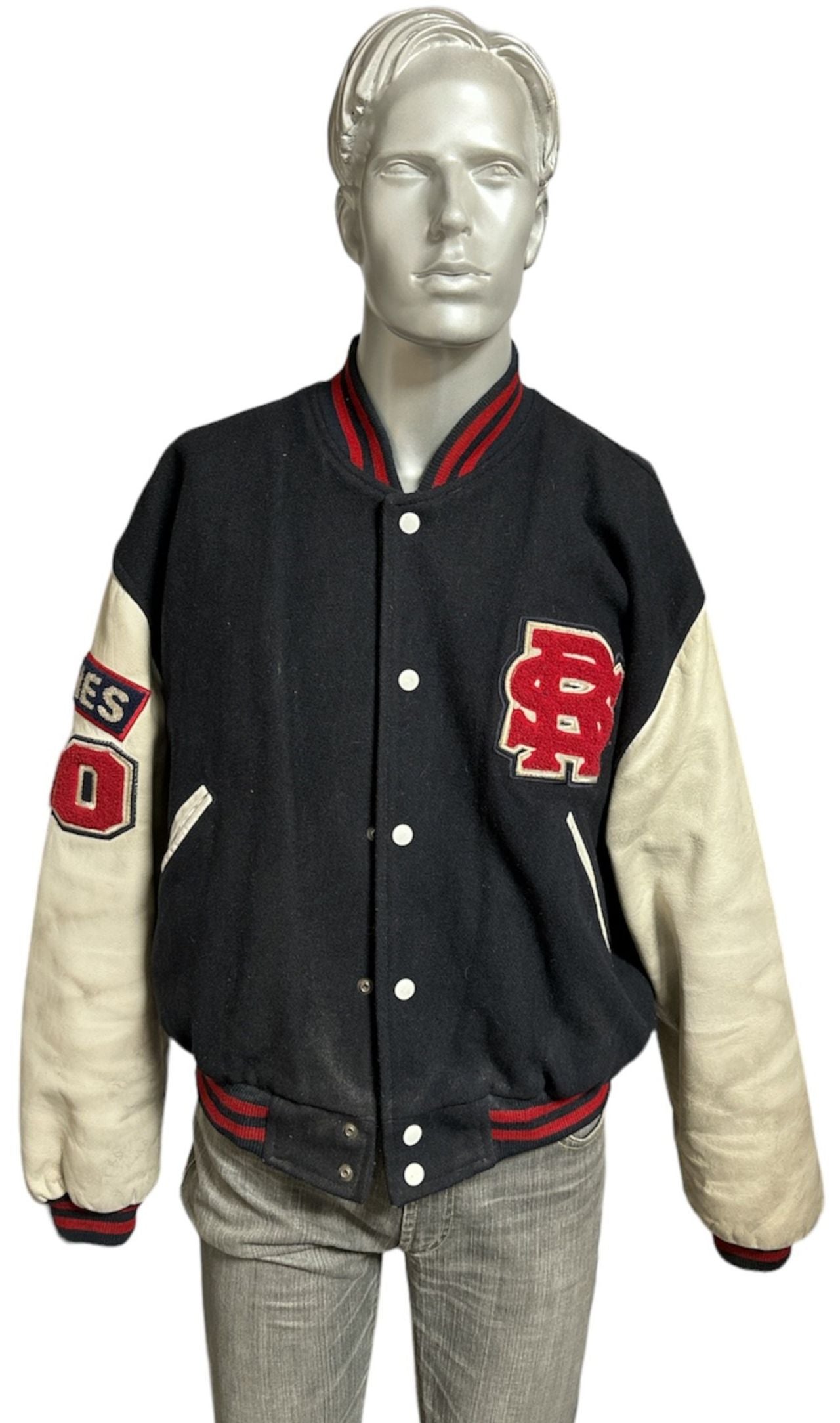 merchandise black and red baseball style jacket with white