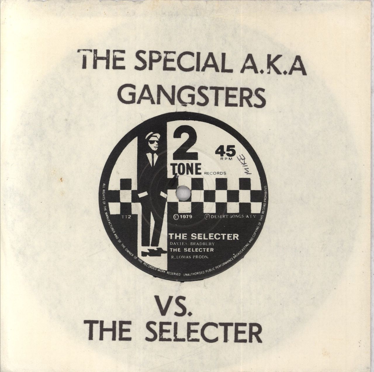 THE SPECIALS Gangsters (1979 UK first issue solid centre 7" single, also including 'The Selecter' by The Selecter, very rare rubber stamped 'The Special A.K.A. VS. The Selecter' die-cut paper sleeve. The sleeve shows light signs of age, mainly to the top of the sleeve, with the vinyl showing light signs of play. The B side shows a handwritten 'MIKE' in pen, with tiny (c. 1mm) gap in the vinyl edge, not affecting play TT1/2)