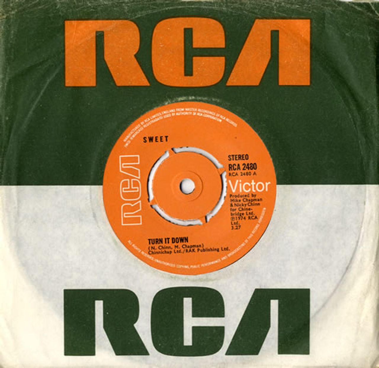 THE SWEET Turn It Down (1974 UK 7" vinyl single with intact four prong centre, also including Someone Else Will, RCA company die cut paper sleeve RCA2480)
