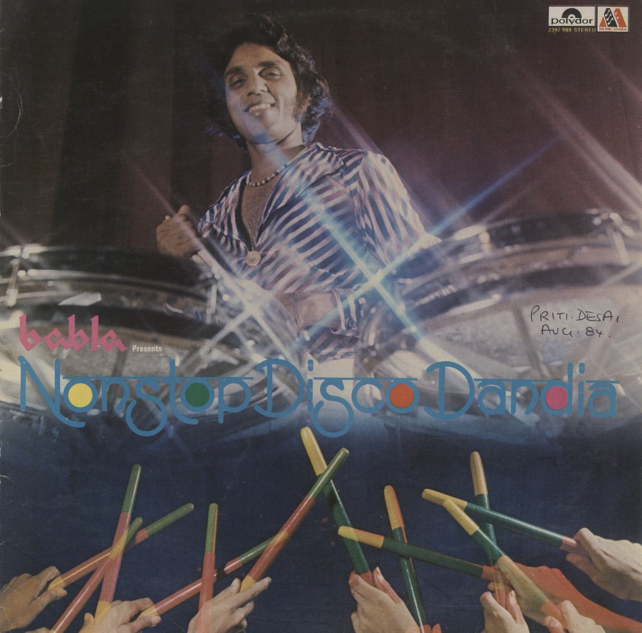 BABLA Non-Stop Disco Dandia (1981 Indian 15-track vinyl LP, a collection of disco-beat film instrumentals written by Kalyanji-Anandji, Laxmikant-Pyarelal, Shankar-Jaikishan and others, picture sleeve. The sleeve has a name annotation to the front, whilst the vinyl is Excellent with few signs of play)