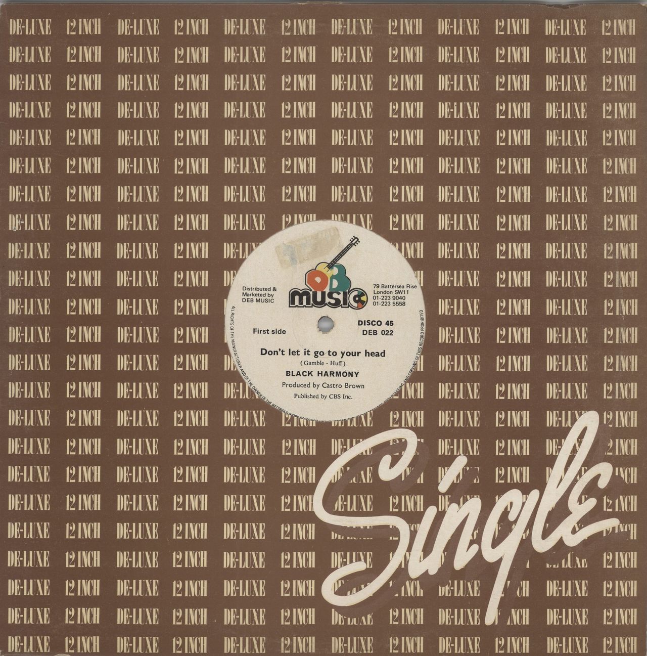 BLACK HARMONY Don't Let It Go To Your Head (1979 UK 2-track 12" vinyl single, includes DEB Players with Don't Let It Get To Your Brain, die-cut sleeve. Despite a sticker tear to one label, the vinyl is Excellent with few signs of play DEB022)