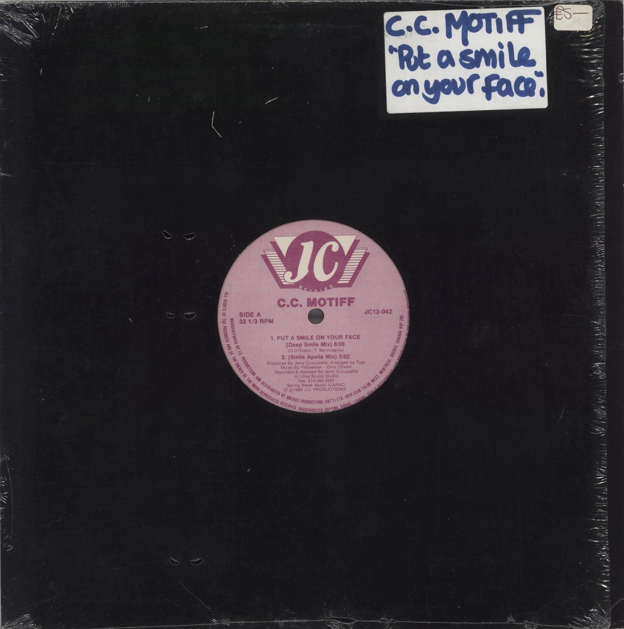 C.C. MOTIFF Put A Smile On Your Face (1989 Canadian 4-track 12" vinyl single, includes Deep Smile Mix, Smile Apella Mix, Mellow Smile Mix and Put Put Dub, plain die-cut sleeve. The sleeve is in its opened stickered shrinkwrap and the vinyl appears barely played JC12-042)