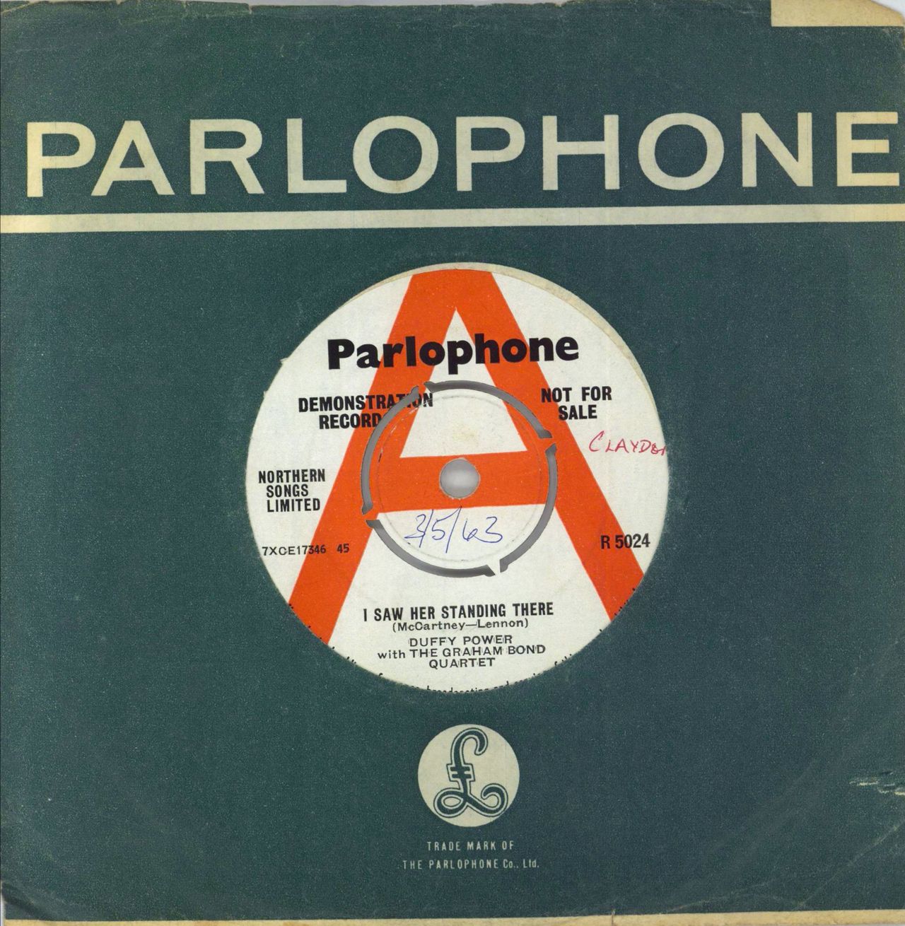 DUFFY POWER With THE GRAHAM BOND QUARTET I Saw Her Standing There (Rare 1963 UK 'A' label demonstration vinyl 7" for the single release with an intact four prong centre. A fantastic soul influenced version of the classic Beatles song and released just three months after the Please Please Me album was released, making this one of the earliest Beatles covers. With backing supplied by The Graham Bond Quartet [Ginger Baker, Graham Bond, Jack Bruce and Big Jim Sullivan], produced by Ron Richards. Also including Farewell Baby, on the B-Side, housed in a Parlophone company die-cut paper sleeve. The label has a name written in red and the release date '3/5/63' also written in the centre, the vinyl remains Excellent with only a few light cosmetic paper scuffs, a stunning example)