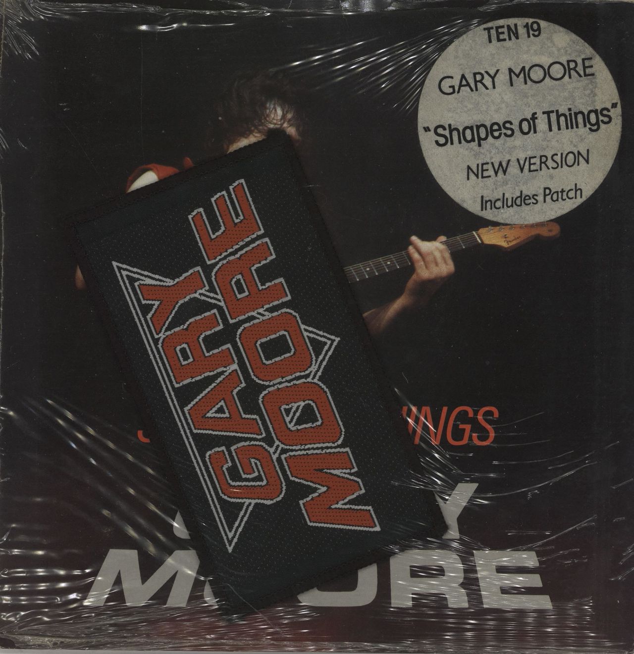 GARY MOORE Shapes Of Things (Limited Edition 1984 UK 2-track 7" single, with Moore taking his axe to The Yardbirds song, also includes 'Blinder'. The glossy picture sleeve remains in the hype-stickered open shrinkwrap & displays only light wear, complete with a bonus unused patch. The vinyl is in Excellent condition with few signs of play TEN19)
