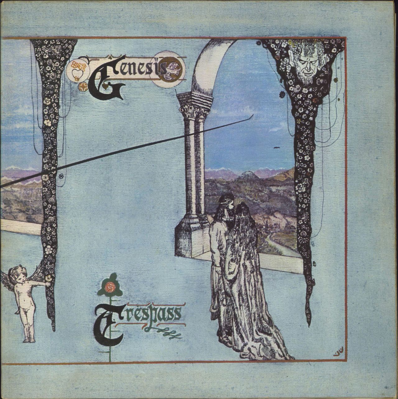 GENESIS Trespass (Early 1970s UK large pink 'Mad Hatter' label issue 6-track LP with 'B&C Records' credit, with textured gatefold picture sleeve designed by Paul Whitehead with scroll logo inside, complete with original lyric insert. The sleeve displays some shelfwear with discolouring to the inner spread, whilst the vinyl shows just minor cosmetic signs of play. Essential Early Genesis classic CAS1020)