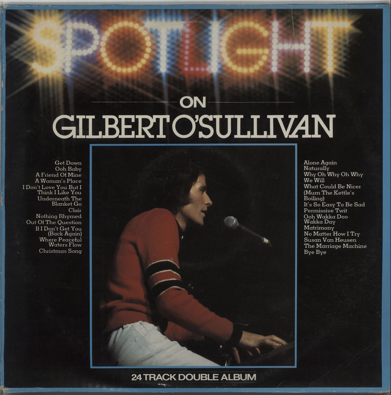 GILBERT O'SULLIVAN Spotlight On Gilbert O'Sullivan (1980 UK MAM label 24-track compilation double vinyl LP, featuring material from the beginning to mid '70s, includin Alone Again Naturally, Nothing Rhymed, Get Down and Matrimony, glossy single pocket picture sleeve. The sleeve shows shows some edge scuffing and a little creasing at the corners however, the vinyl remains in barely played condition SPOT1002)
