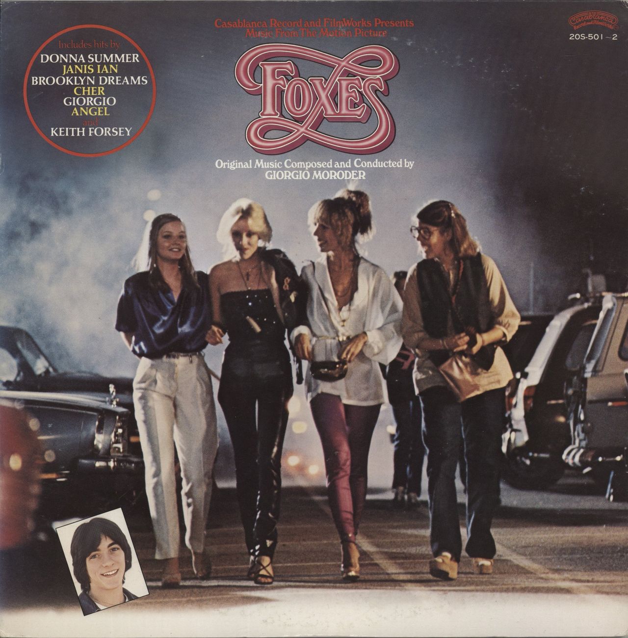 ORIGINAL SOUNDTRACK Foxes (1980 Japanese 12-track sample double vinyl LP with custom promotional white Casablanca labels, Giorgio Moroder's movie score, gatefold picture sleeve with fold-out lyric insert as well as Japanese PR information sheet. The sleeve shows light wear and the vinyl is Near Mint 20S-501-2)