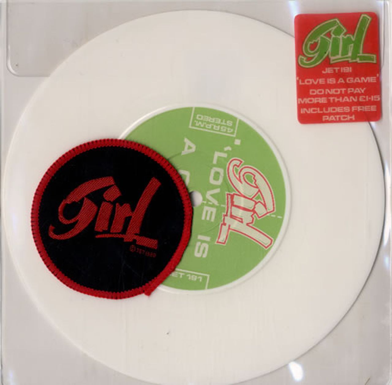 GIRL Love Is A Game (1980 UK limited edition 7" single pressed on White Vinyl, also includes Little Miss Ann, housed in a custom stickered PVC sleeve with bonus sew-on patch & open sticker seal on the back JET191)