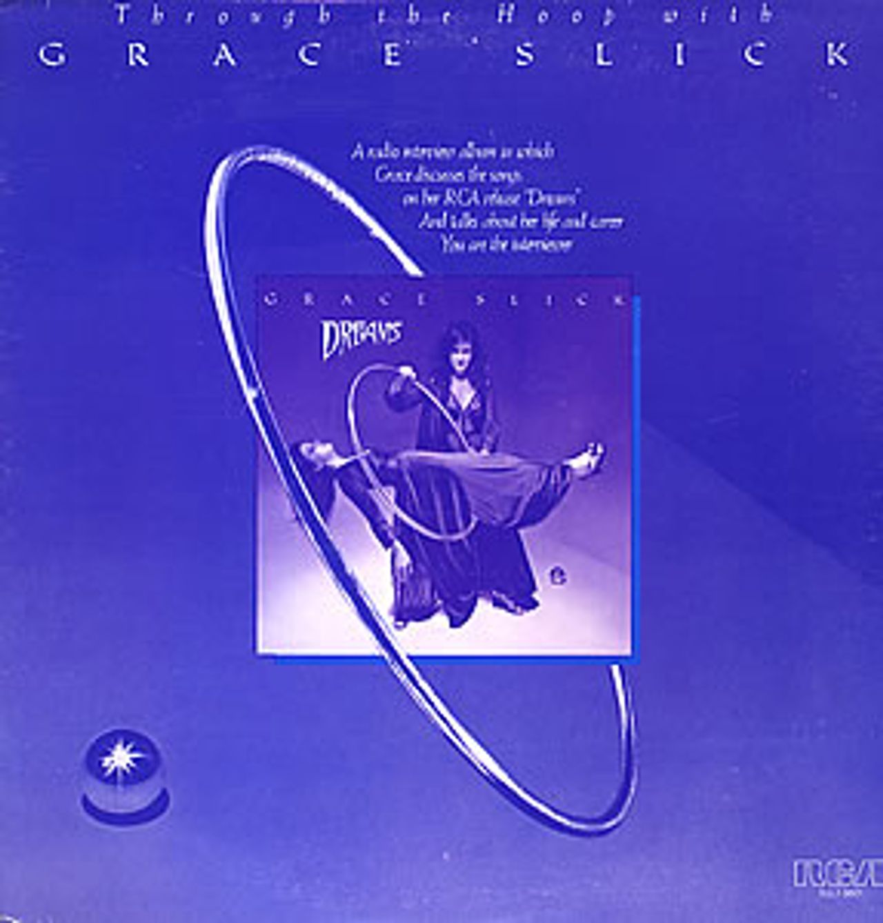 GRACE SLICK Through The Hoop (1980 US promotional-only 16-track interview LP with custom black on white labels, issued to radio stations to promote the release of the album, Dreams. Grace discusses track by track the songs on the album as wellas her life & career, housed in a unique 'Not For Sale' picture sleeve with 'guide script' inner. The sleeve shows some general shelf wear including a little scuffing at the edges but is otherwise in nice shape. The vinyl appears near 'as new' DJL1-3601)