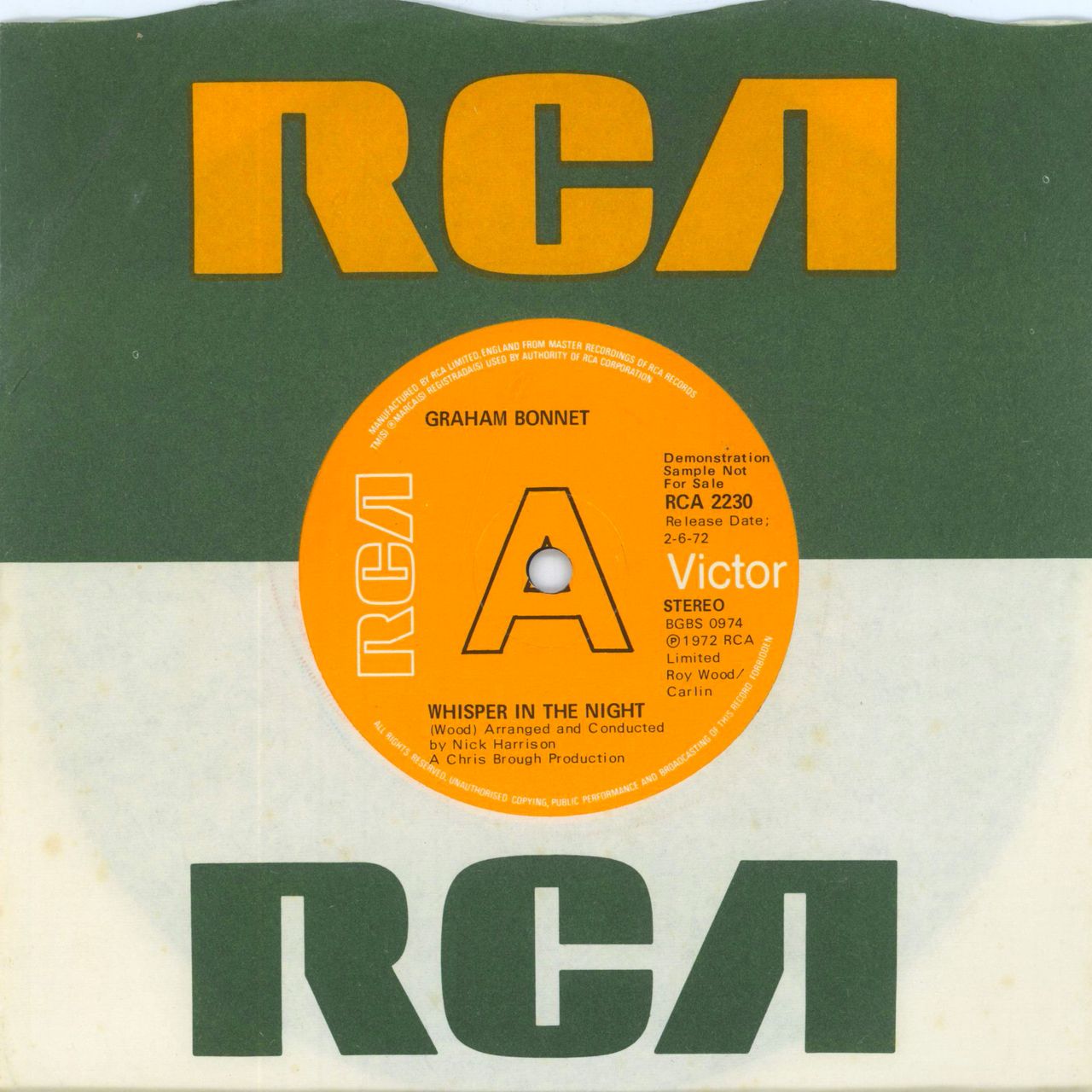GRAHAM BONNET Whisper In The Night (1972 UK 'A' label demonstration sample vinyl 7" for the single release, with intact four prong centre & release date of 2-6-72 on the label, also featuring Rare Specimen, RCA company die cut paper sleeve RCA2230)