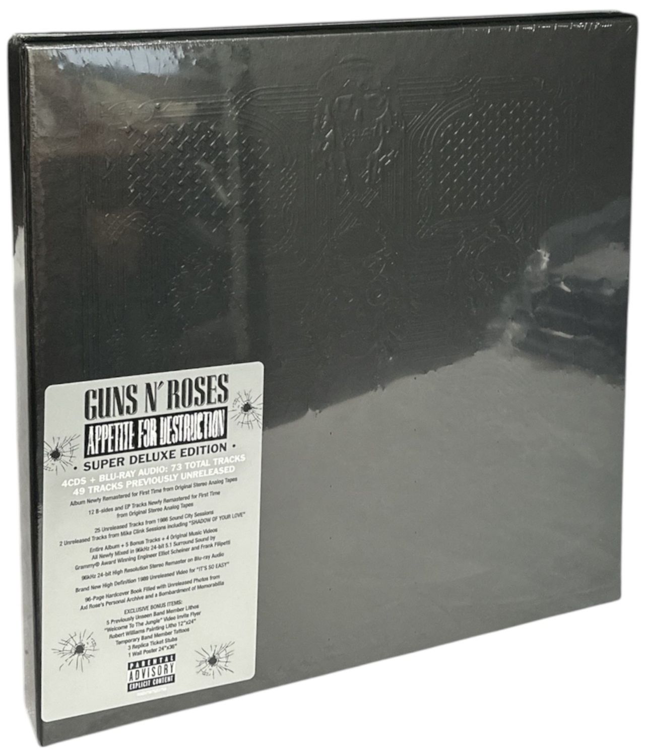GUNS N ROSES Appetite For Destruction (2018 UK Super Deluxe Limited Edition 4-CD/1-Blu-Ray box set comprising the original 12-track CD album, a 12-track 'B-Sides N' EPs Remastered' CD, a 12-track '1986 Sound City Session' CD and 15-track '1986Sound City Session N' More' CD; plus a 22-track Blu-Ray disc featuring a 24-bit 5.1 surround sound and remastered stereo issue of the album, along with five bonus tracks and five music videos. Includes a 96-page hardback book, five band member lithos, Robert Williams painting litho, temporary band member tatoos, three replica ticket stubs and a 24" x 26" poster. All housed in a factory sealed 12" x 12" embossed black slipcase)