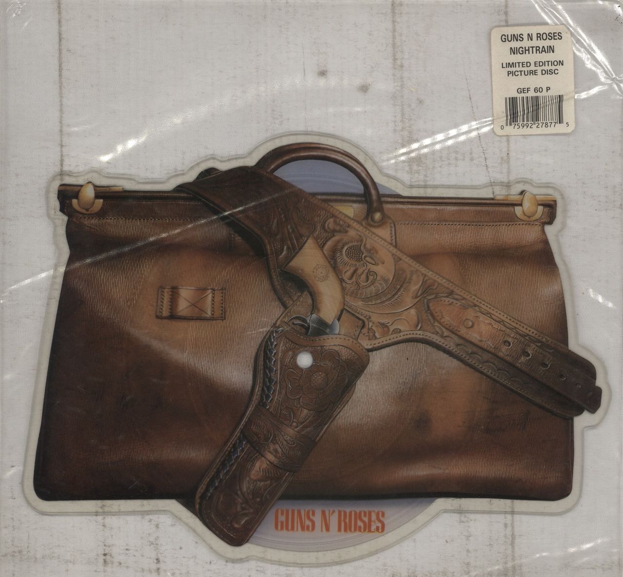 GUNS N ROSES Nightrain (Very collectable 1989 UK limited edition bag shaped 7" shaped Picture Disc single, also including Reckless Life, title & barcode stickered clear PVC sleeve. The PVC sleeve and sticker have some creasing, but the disc remains near as new GEF60P)