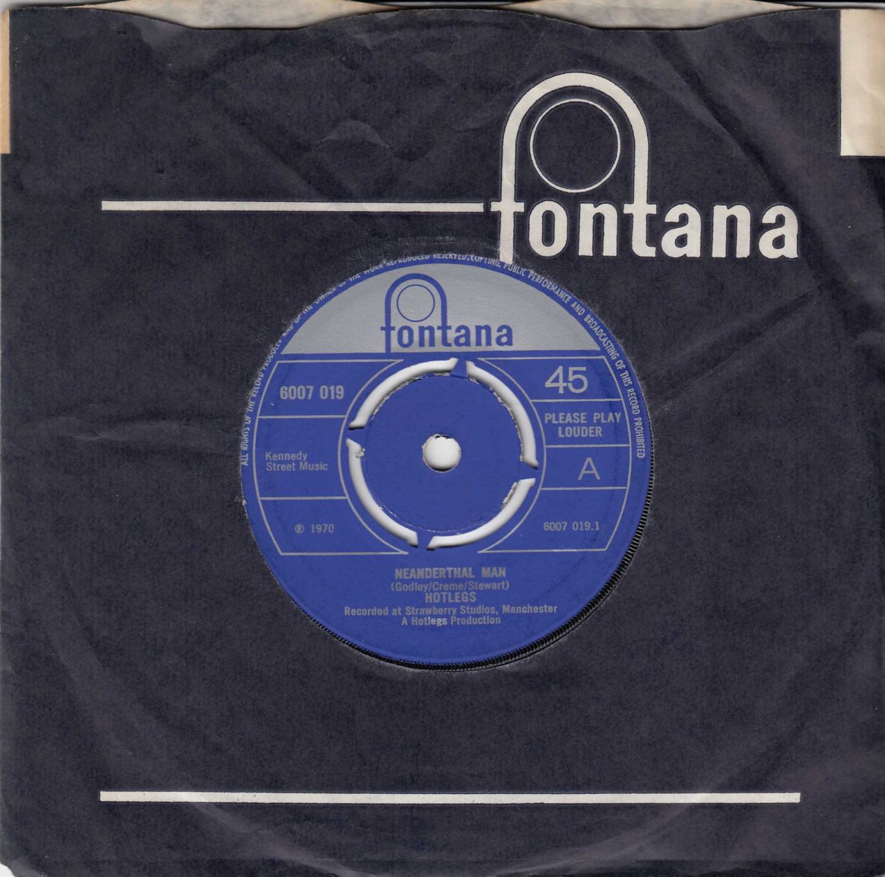 HOTLEGS Neanderthal Man (1970 UK 7" vinyl single with intact four prong centre, also featuring You Didn't Like It Because You Didn't Think Of It, record company die cut paper sleeve. The vinyl displays the odd cosmetic scuff and hairline but remains excellent)