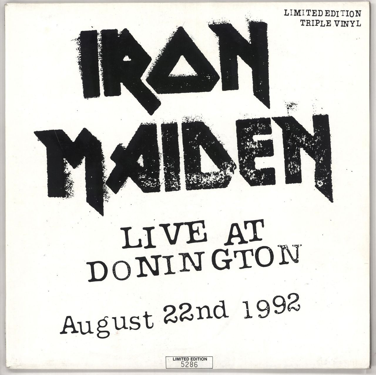 IRON MAIDEN Live At Donington (Rare 1993 UK limited edition 20-track vinyl 3-LP set recorded live at the Monsters Of Rock Festival at Donington on the 22nd August 1992, housed in an individually numbered 'bootleg' style single pocket picture sleeve. According to Iron Maiden fan club secretary Keith Wilfort, it was originally deicided to be released in 10.000 copies, and so the covers were printed first, but the pressing stopped at 5.000! Hence there are some covers with number between5.001 - 10.000, but there are only 5.000 copies. The sleeve shows only light wear and the vinyl has minimal signs of play. An outstanding copy DON1)
