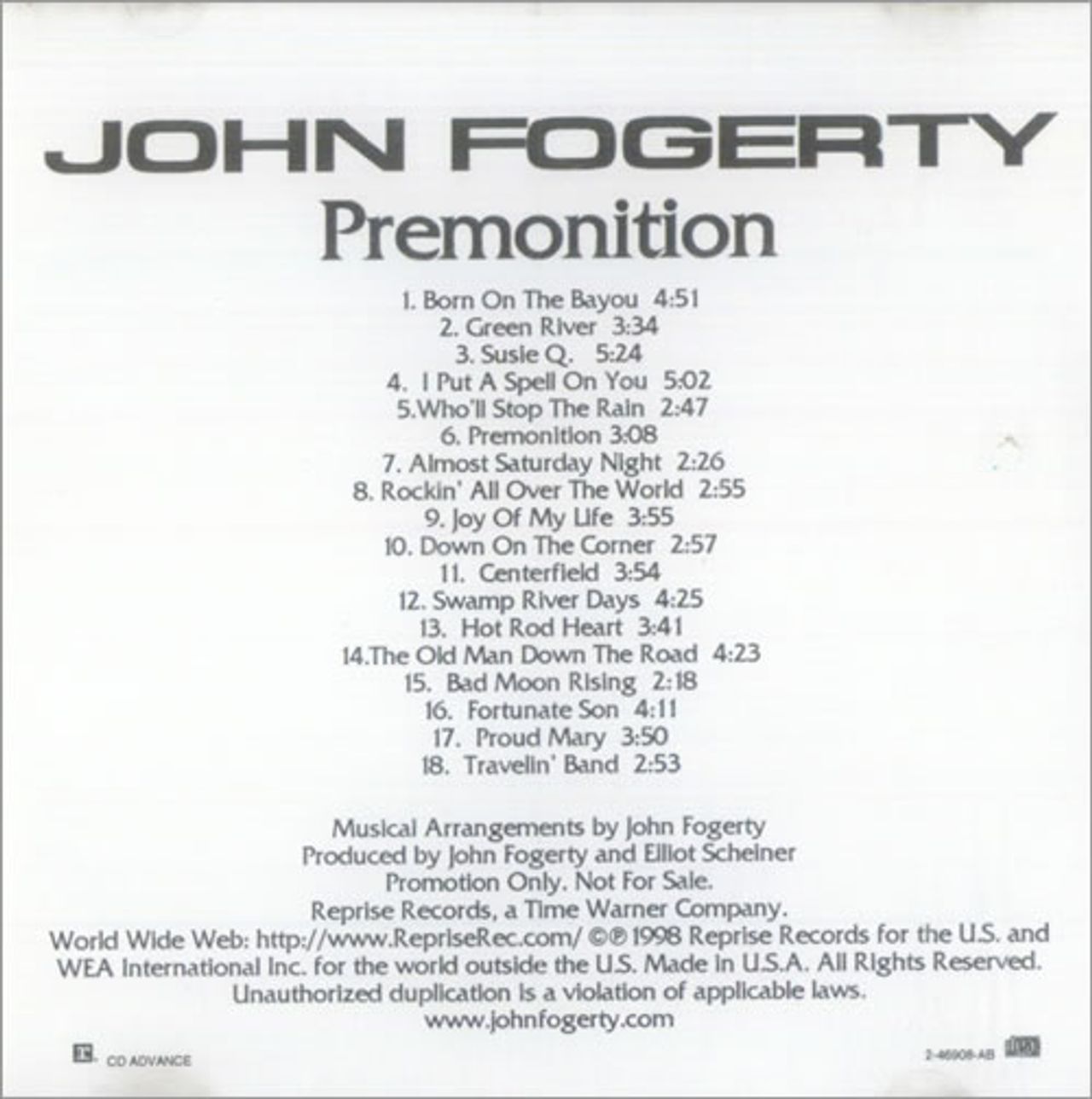 JOHN FOGERTY Premonition (Official 1998 US Reprise label 18-track in-house pre-advance promotional CD-R for the live album recorded with an audience at Warner Bros. Studios, Stage 15 on December 12 & 13th 1997, featuring material from histime in Creedence Clearwater Revival and as a solo artist. Custom printed disc complete with a custom studio title/tracklisting inlay with information on the inside)