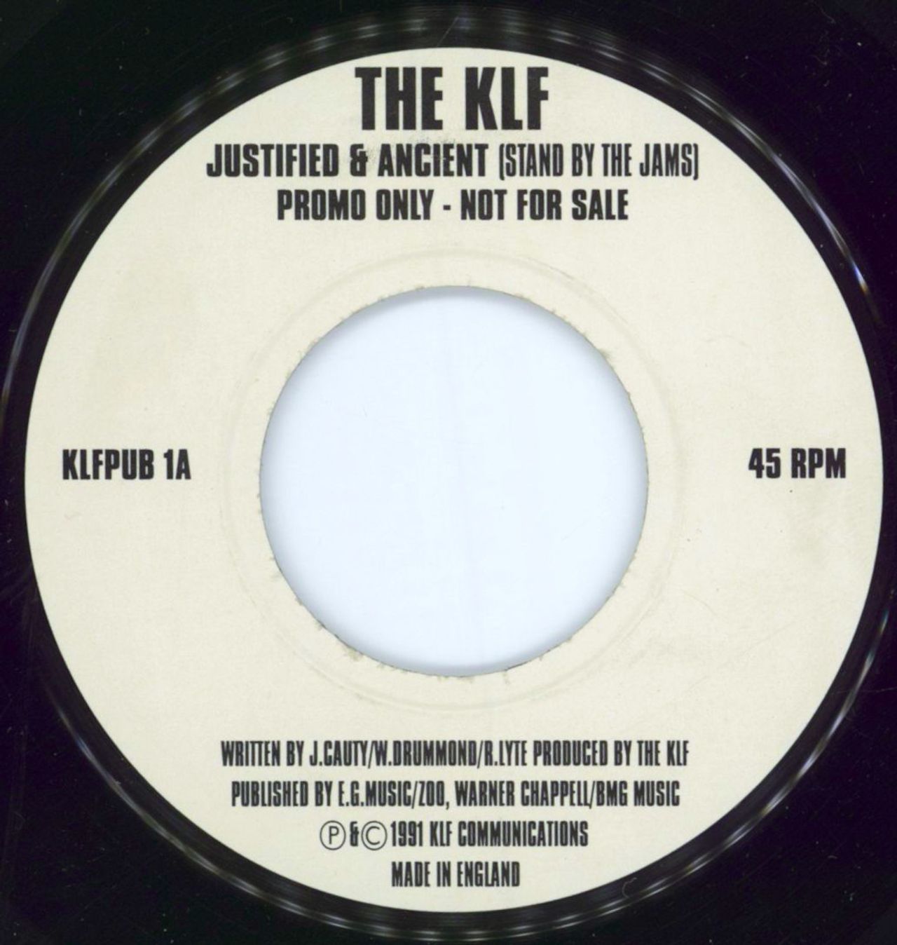 KLF Justified & Ancient/America:What Time Is Love? (1992 UK 2-track promotional-only jukebox edition 7" vinyl single released on KLF Communications, includes Radio Edit Version and Justified & Ancient [Stand By The Jams], custom printed labels KLFPUB1)