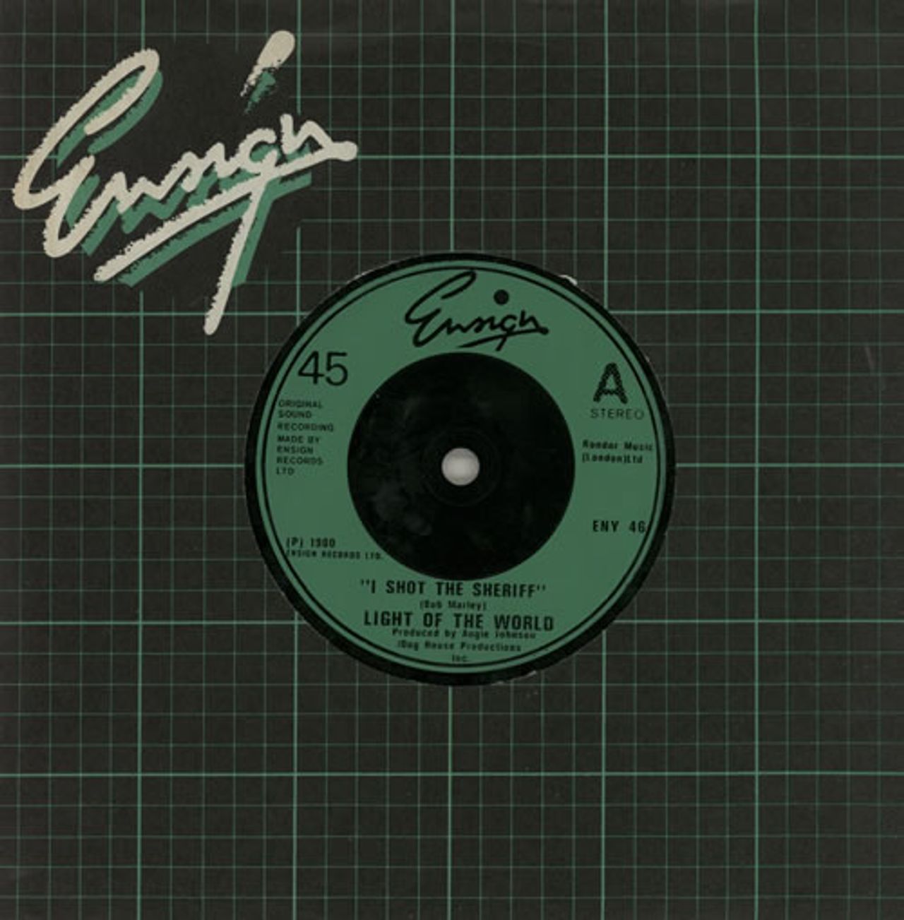 LIGHT OF THE WORLD I Shot The Sherrif (1980 UK 7" vinyl single with injection moulded labels, adding a touch of Brit-Funk to Bob Marley's original, backed with A New Soft Song, die cut company sleeve ENY46)