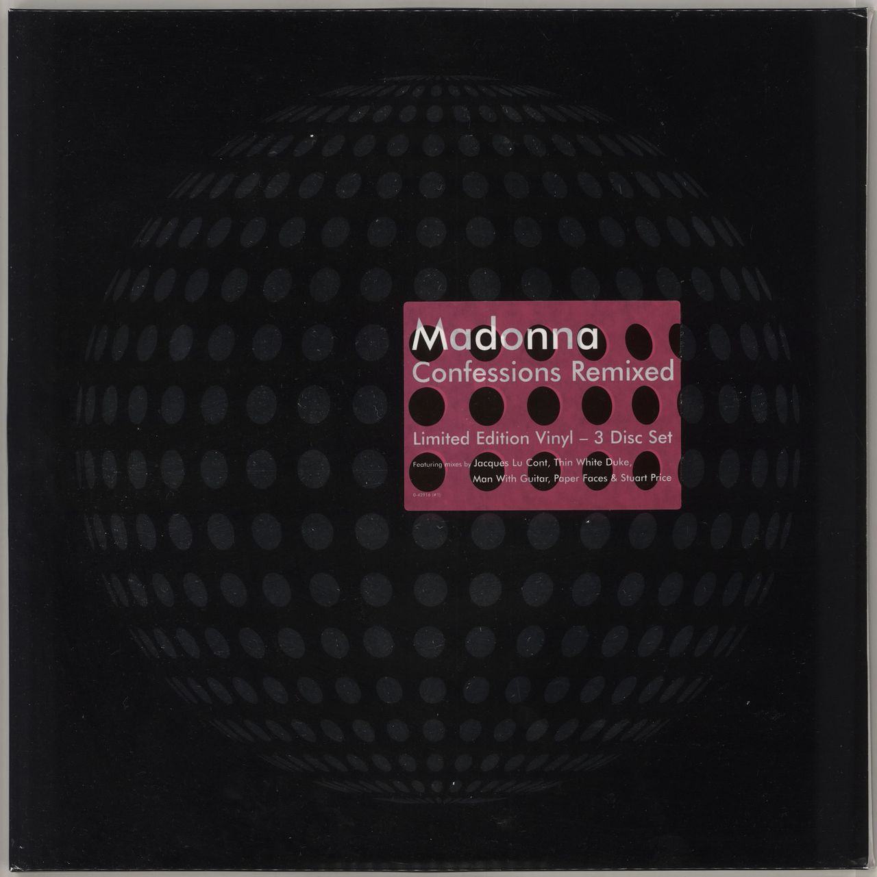 MADONNA Confessions Remixed (2006 US Special Limited Edition 6-track triple vinyl 12" set featuring mixes of five tracks taken from her critically acclaimed #1 album 'Confessions On A Dance Floor', including Hung Up [SDP's Extended Vocal & Dubmixes], Sorry [Man With Guitar Mix], Get Together [Jacques Lu Cont Mix], I Love New York [Thin White Duke Mix] and Let It Will Be [Paper Faces Mix]. The hype stickered single pocket silver metallicised picture sleeve shows the odd light scuffand crease, whilst all three vinyl discs look barely played; remaining in Near Mint condition)