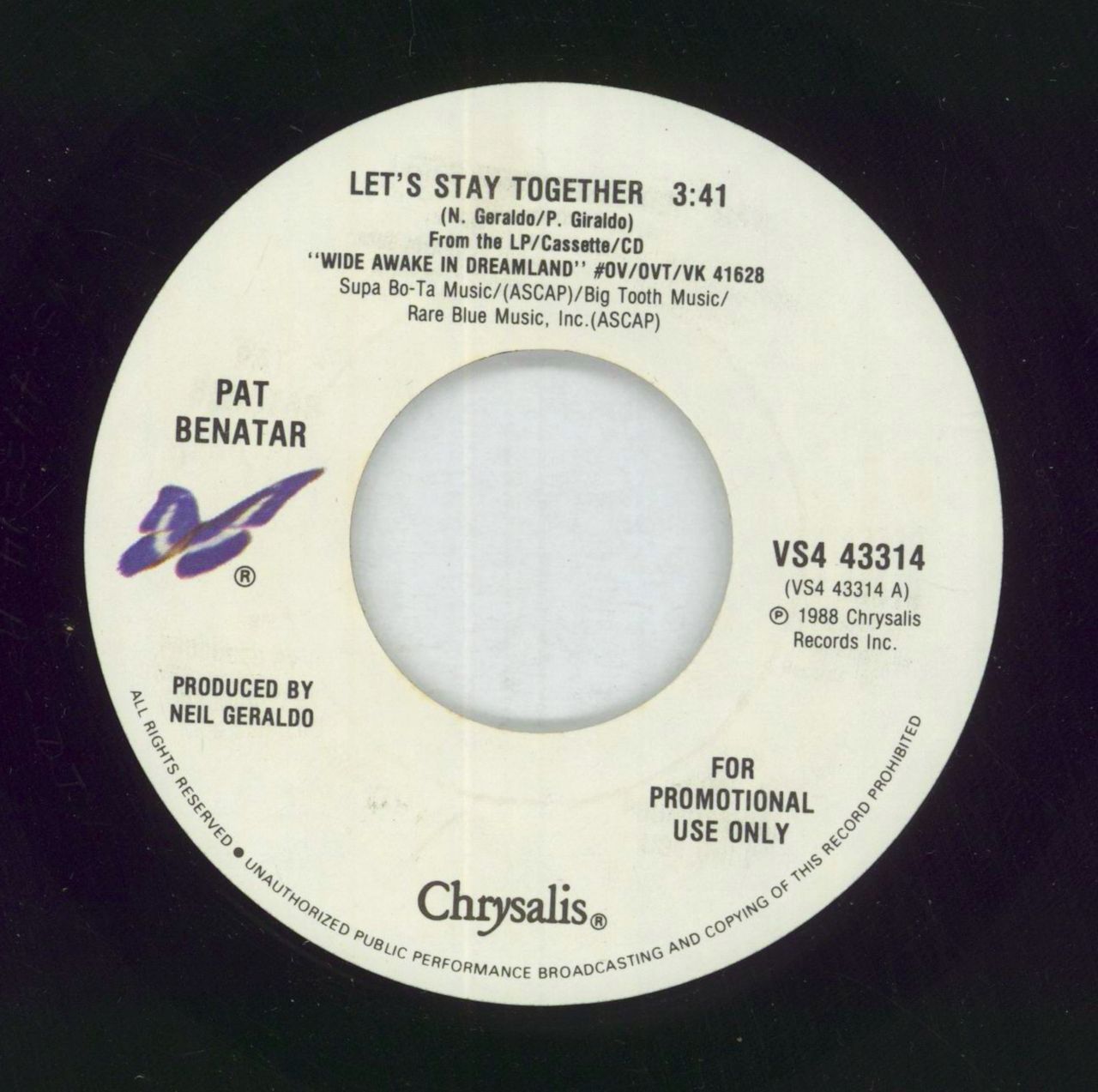 PAT BENATAR Let's Stay Together (Promotional 1988 US wide centered 7" single, with the same track on both sides. Housed in plai die cut sleeve. The sleeve and vinyl remain in excellent condition! VS443314)