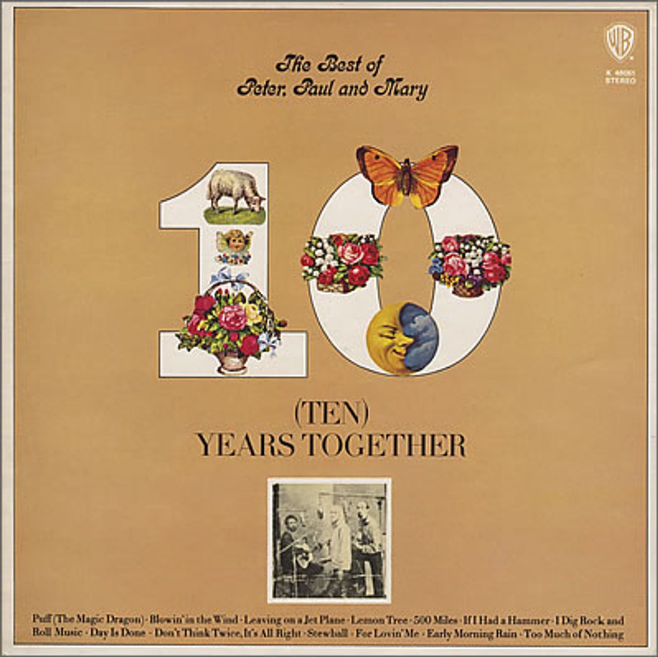 PETER PAUL & MARY Ten Years Together: The Best Of Peter, Paul And Mary (1970 UK 13-track compilation LP on the green WB label, includes Puff The Magic Dragon, Leaving On A Jet Plane and Lemon Tree, great picture sleeve designed by Milton Glaser. The sleeve shows mild ring/edge wear and sticker removal marks, while the vinyl displays some faint hairlines and cosmetic surface scuffs but remains excellent K46051)