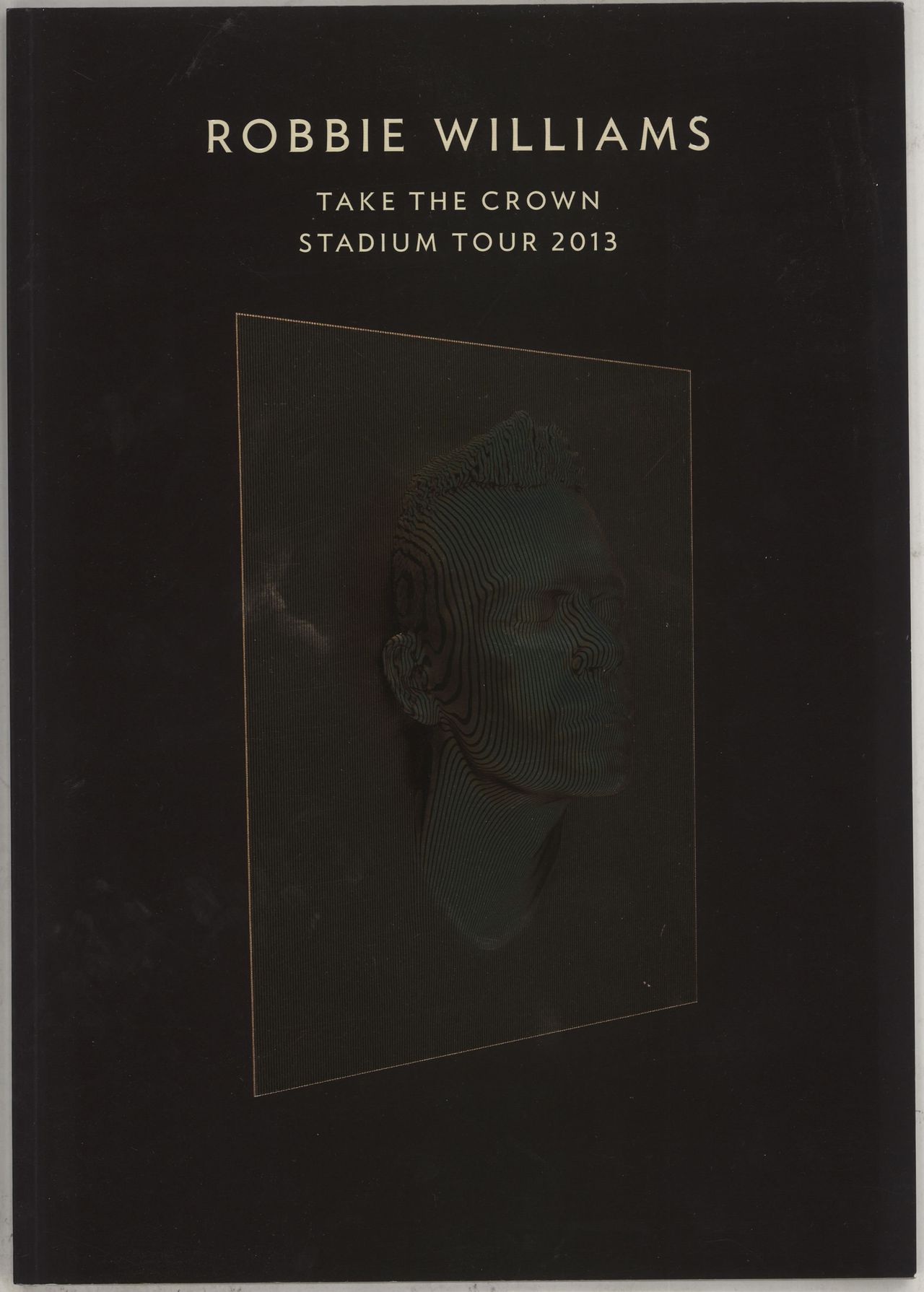 ROBBIE WILLIAMS Take The Crown Stadium Tour 2013 (2013 UK 9½ x 13" tour programme issued during his stadium tour dates in Europe between June to August 2013, including an extensive interview with Robbie, behind the scenes photos of rehearsalsand the statues/glitterheads being produced, a full list of tour crew & personnel and more, with gold-embossed glossy cover)