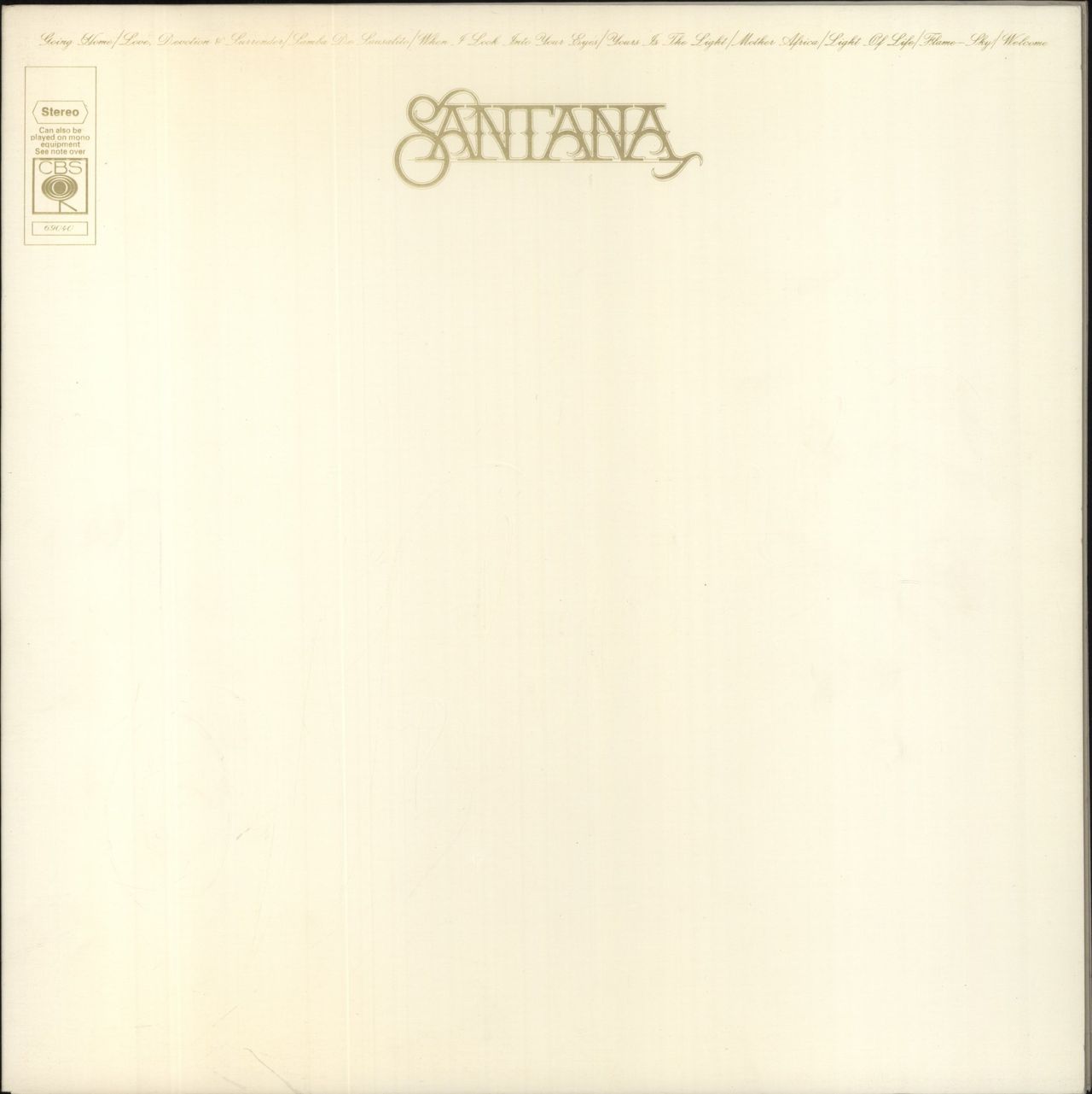 SANTANA Welcome (1973 UK 9-track vinyl LP with white CBS label variant, the fifth studio album, including Love, Devotion & Surrender, Mother Africa & Flame Sky, co-written with collaborator and Mahavishnu initiate John McLaughlin, also featuring the John Coltrane penned title track. Housed in an embossed gatefold picture sleeve. The sleeve shows minimal wear and the vinyl has a light cosmetic surface scuff on Side 2 - overall an excellent example)