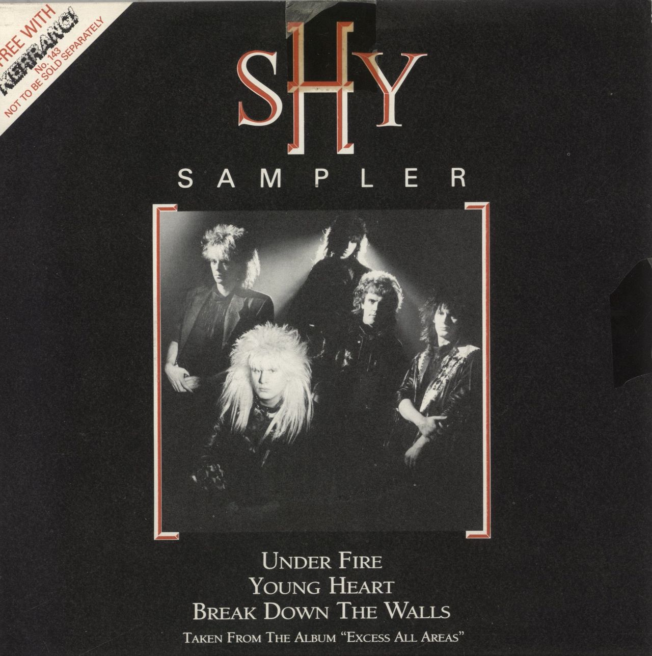 SHY Shy Sampler (1987 UK RCA solid centre promotional vinyl 7" sampler issued with Kerrang Magazine [Issue 143] including Under Fire, Young Heart and Break Down The Walls, housed in the custom printed picture sleeve. The is a little tape residueon the sleeve where it was attached to the magazine, otherwise the sleeve and vinyl are in Excellent condition and the vinyl SHY100)