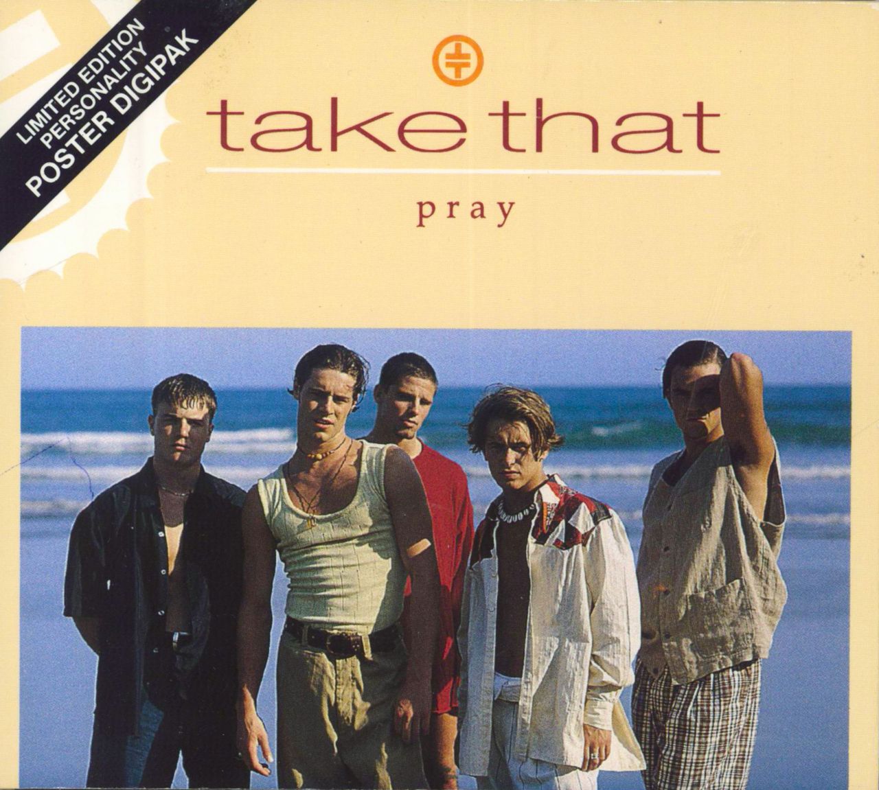 TAKE THAT Pray (Scarce 1993 Australian only 7-track CD, including four versions of the title track, also including It Only Takes A Minute [Tommy Musto Club Mix], Once You've Tasted Love [Harding & Curnow Remix] and It Only Takes A Minute [Tommy Musto Underground Vocal], housed in a digipak picture complete with the limited fold-out poster which still remains attached to the sleeve!)