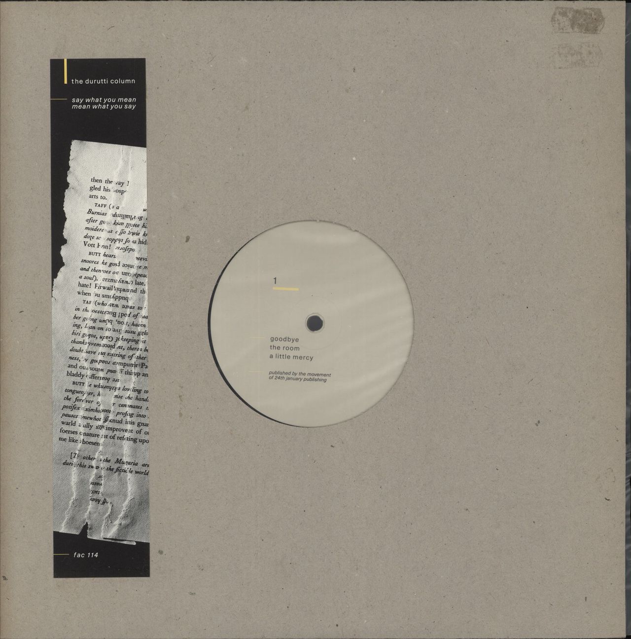 DURUTTI COLUMN Say What You Mean, Mean What You Say (Scarce 1985 UK Factory Records 6-track 12" vinyl EP including Goodbye, The Room, A Little Mercy, Silence, E.E. & Hello. The custom-stickered die-cut card sleeve shows minimal wear and the vinyl displays only minimal signs of play)