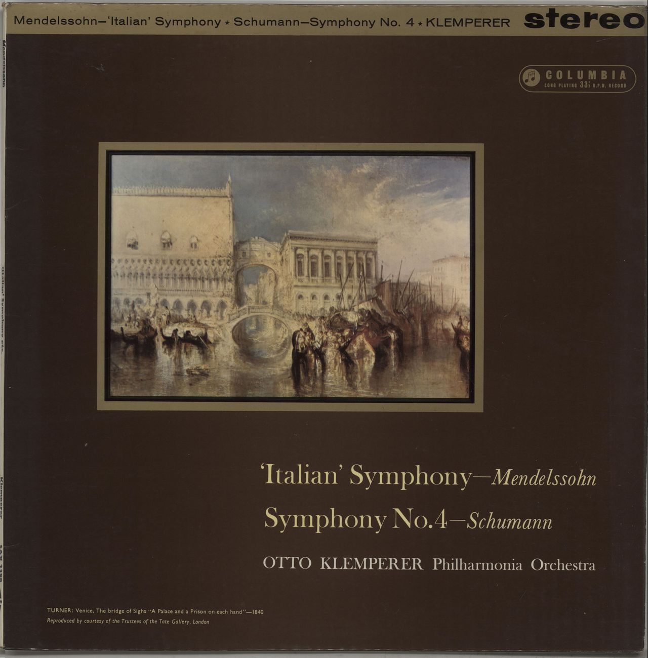 THE PHILHARMONIA ORCHESTRA conducted by OTTO KLEMPERER Mendelssohn: 'Italian' Symphony / Schumann: Symphony No.4 (Rare 1961 UK first edition STEREO LP on the silver rimmed turquoise Columbia label, front laminated flipback picture sleeve. The sleeve shows just a little light shelfwear & the vinyl remains in wonderful condition with few signs of play SAX2398)