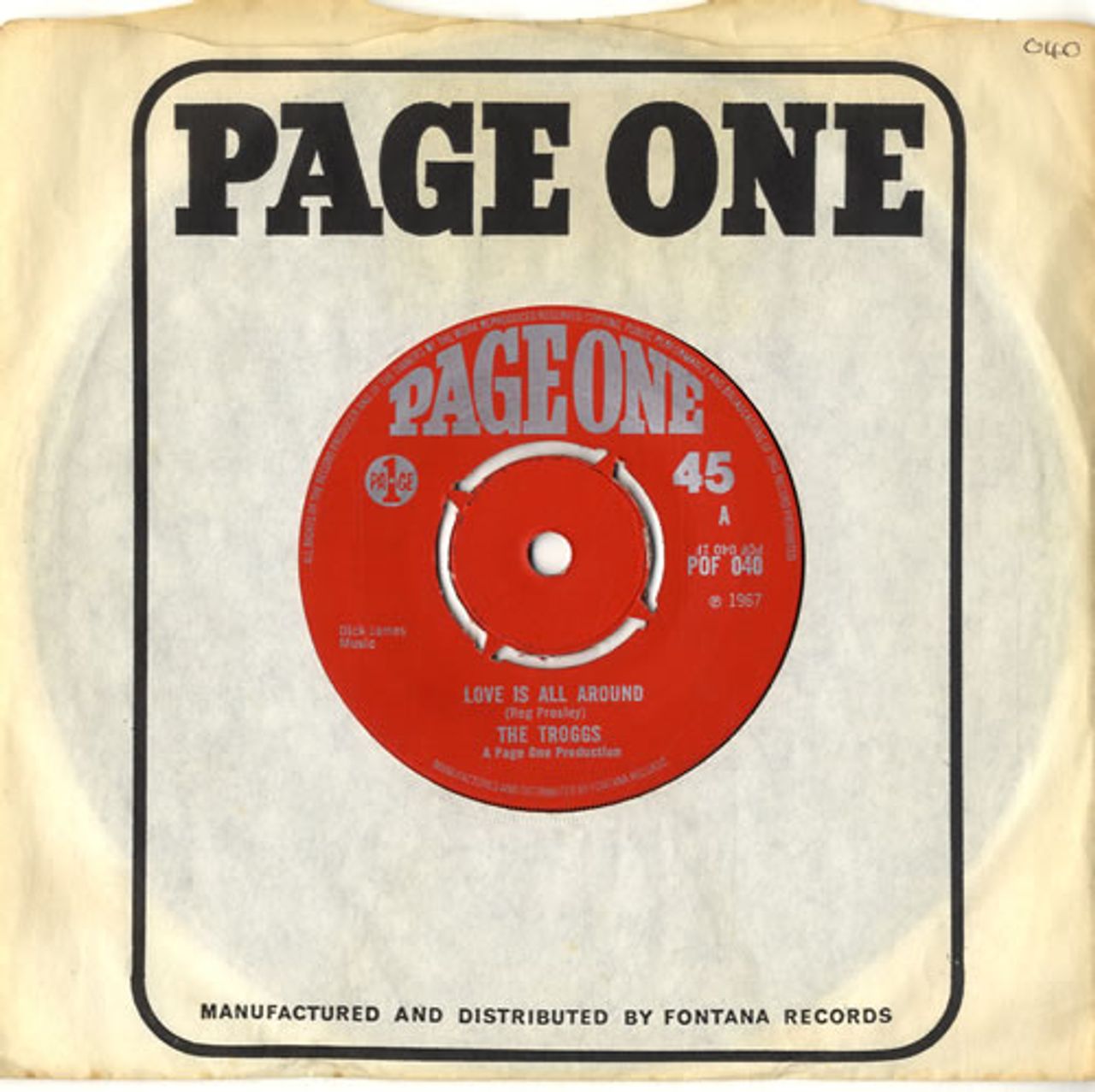 THE TROGGS Love Is All Around (1969 UK second issue of the 1967 7" vinyl single with intact four prong centre, also including When Will The Rain Come, Page One company die-cut paper sleeve POF040)
