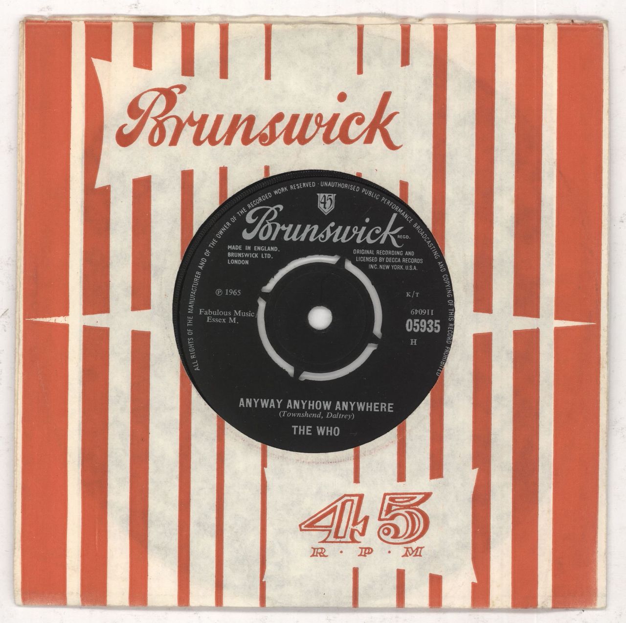 THE WHO Anyway Anyhow Anywhere (1965 UK 7" vinyl single with intact four prong centre, also includes Daddy Rolling Stone, Brunswick company die-cut paper sleeve. The vinyl shows signs of spindle wear & surface marks which have little to no effectduring play with no major deterioration in sound quality)