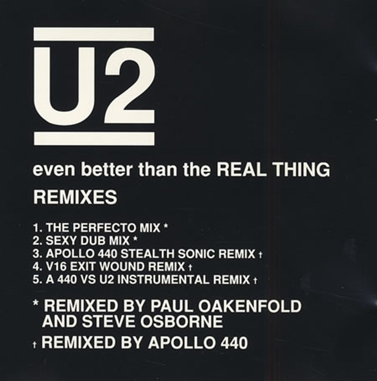 U2 Even Better Than The Real Thing (1992 US 5-track CD single featuring five mixes of the title track including Perfecto & Sexy Dub Mixes by Paul Oakenfold & Steve Osbourne, Apollo 440 Stealth Sonic, V16 Exit Wound & A440 VS U2 Instrumental Remixes by Apollo 440, housed in a jewel case with picture sleeve)