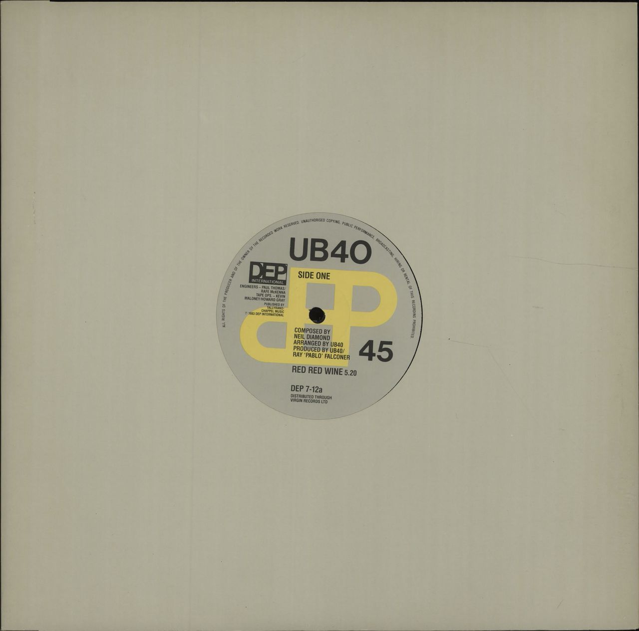 UB40 Red Red Wine (1983 UK 12" vinyl single, also including Sufferin', housed in a grey die-cut sleeve which matches the labels. Both sleeve and vinyl look Excellent with few signs of wear and play DEP7-12)