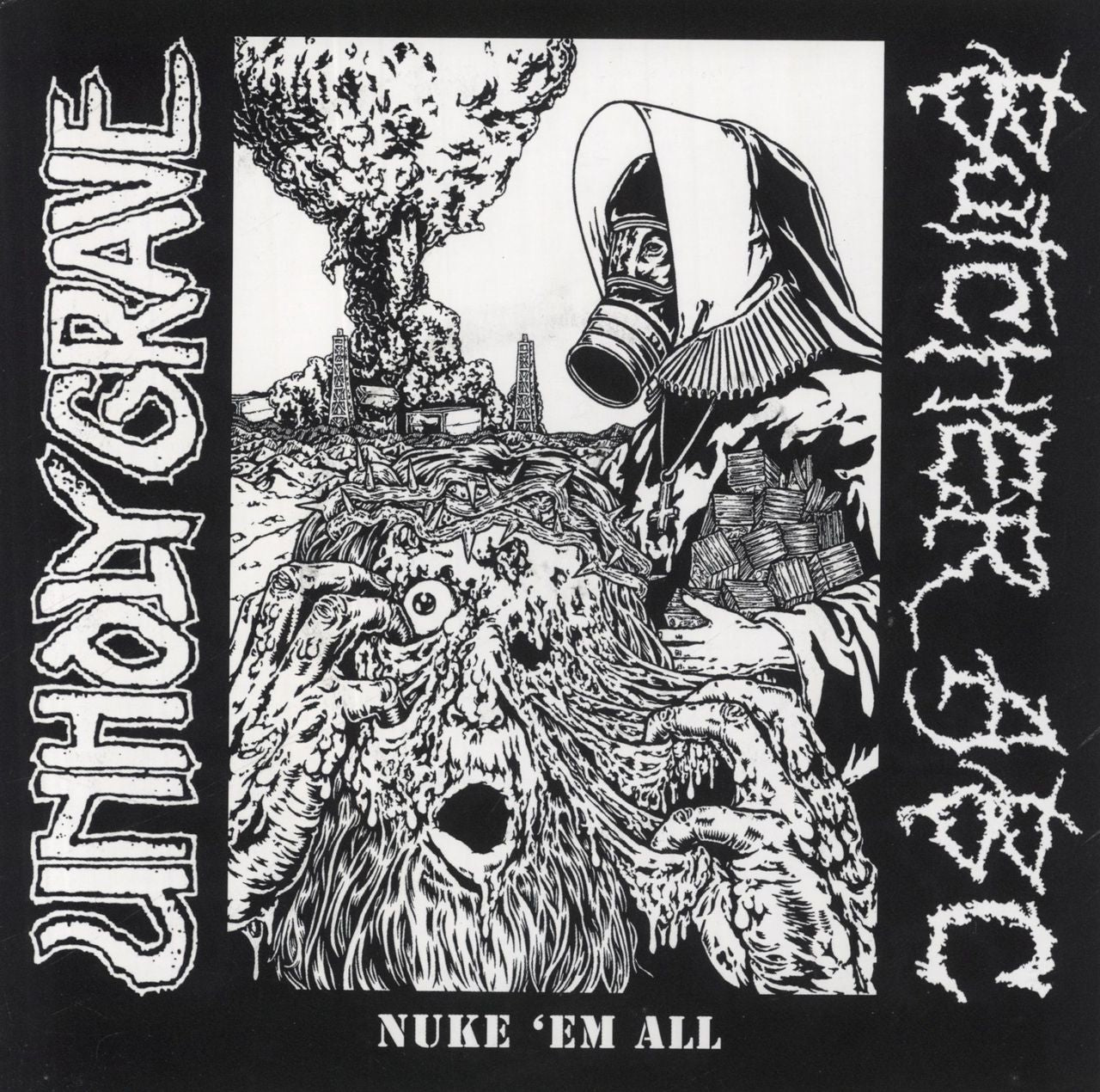 UNHOLY GRAVE / BUTCHER ABC Nuke 'Em All (2015 US 3-track 7" vinyl split EP. Wrap-around picture sleeve. HHR84)