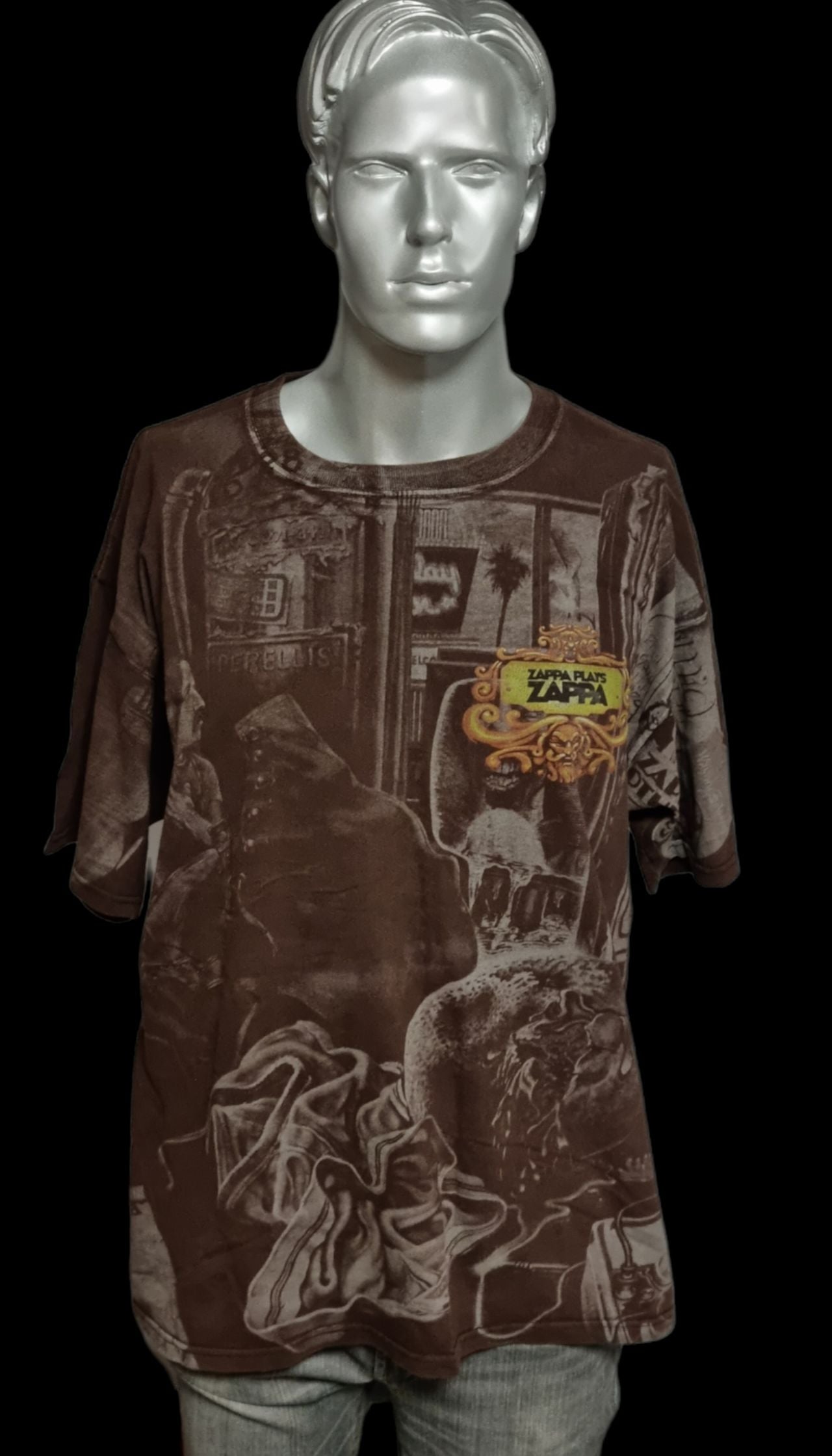 ZAPPA PLAYS ZAPPA Zappa Plays Zappa (00s US Officially Licensed 100% cotton brown short sleeved t-shirt with full artwork to front in faded white & ornamented band name logo on the left breast in light green, with the Zappa Family Trust logo inside. American Size - 2X. Excellent condition)