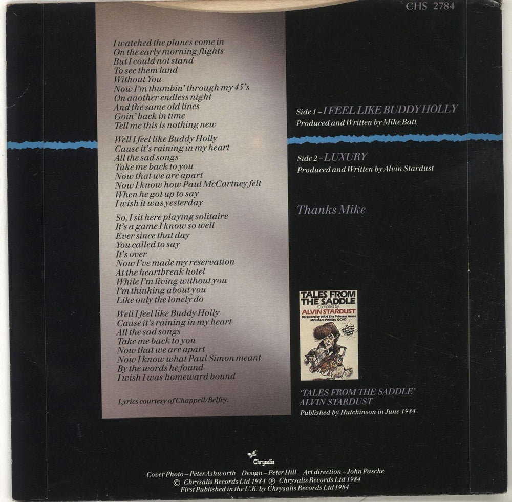 ALVIN STARDUST I Feel Like Buddy Holly (1984 UK 7" vinyl single, also including Luxury, picture sleeve with lyrics on reverse CHS2784)