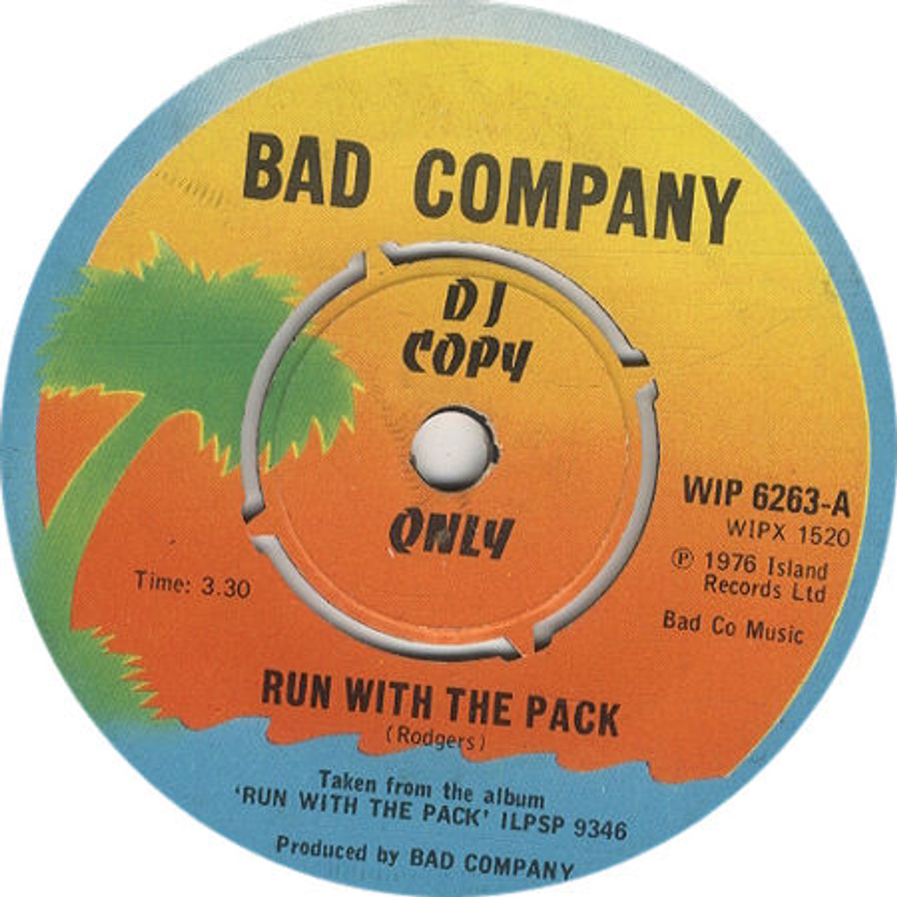 BAD COMPANY Run With The Pack (1976 UK 2-track promotional orange Island label vinyl 7" single with 'DJ Copy Only' text on the intact original four prong centre, also includes Do Right By Your Woman, plain die cut paper sleeve WIP6263)