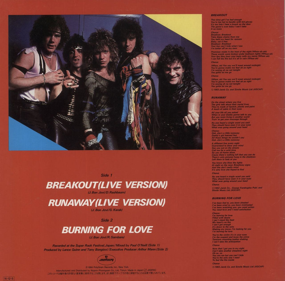 BON JOVI Burning For Love (1984 Japanese-only 3-track 12" vinyl EP, released to promote their then Japanese tour, including Breakout & Runaway live at the Super Rock Festival Japan, housed in a unique red striped live picture sleeve. The sleevedisplays only light general wear whilst the vinyl has only light signs of play, overall an excellent example 15PP-44)