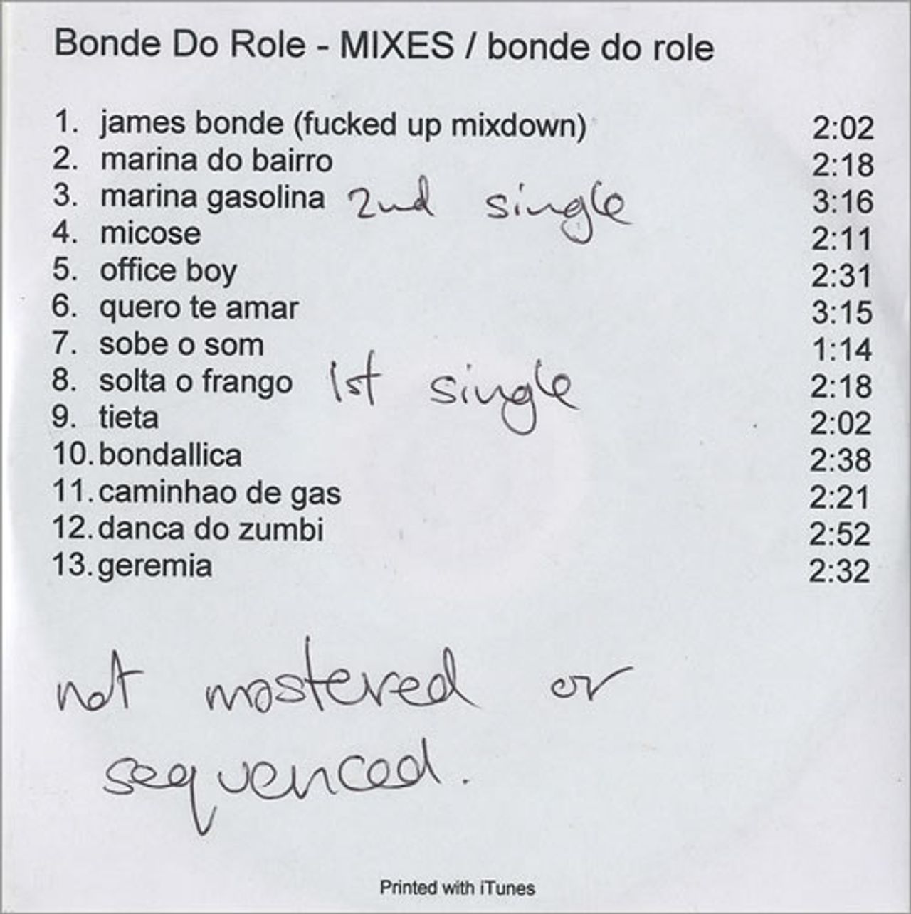 BONDE DO ROLE With Lasers - Unmastered And Unsequenced (Rare 2007 UK 13-track promotional-only CD-R acetate featuring the unmastered and unsequenced second album from the Brazilian funk carioca group. Includes the singles Office Boy, Solta O Frango, Marina Gasolina and James Bonde. Handwritten CD-R housed in a custom prined and biro anotated wrap around sleeve)