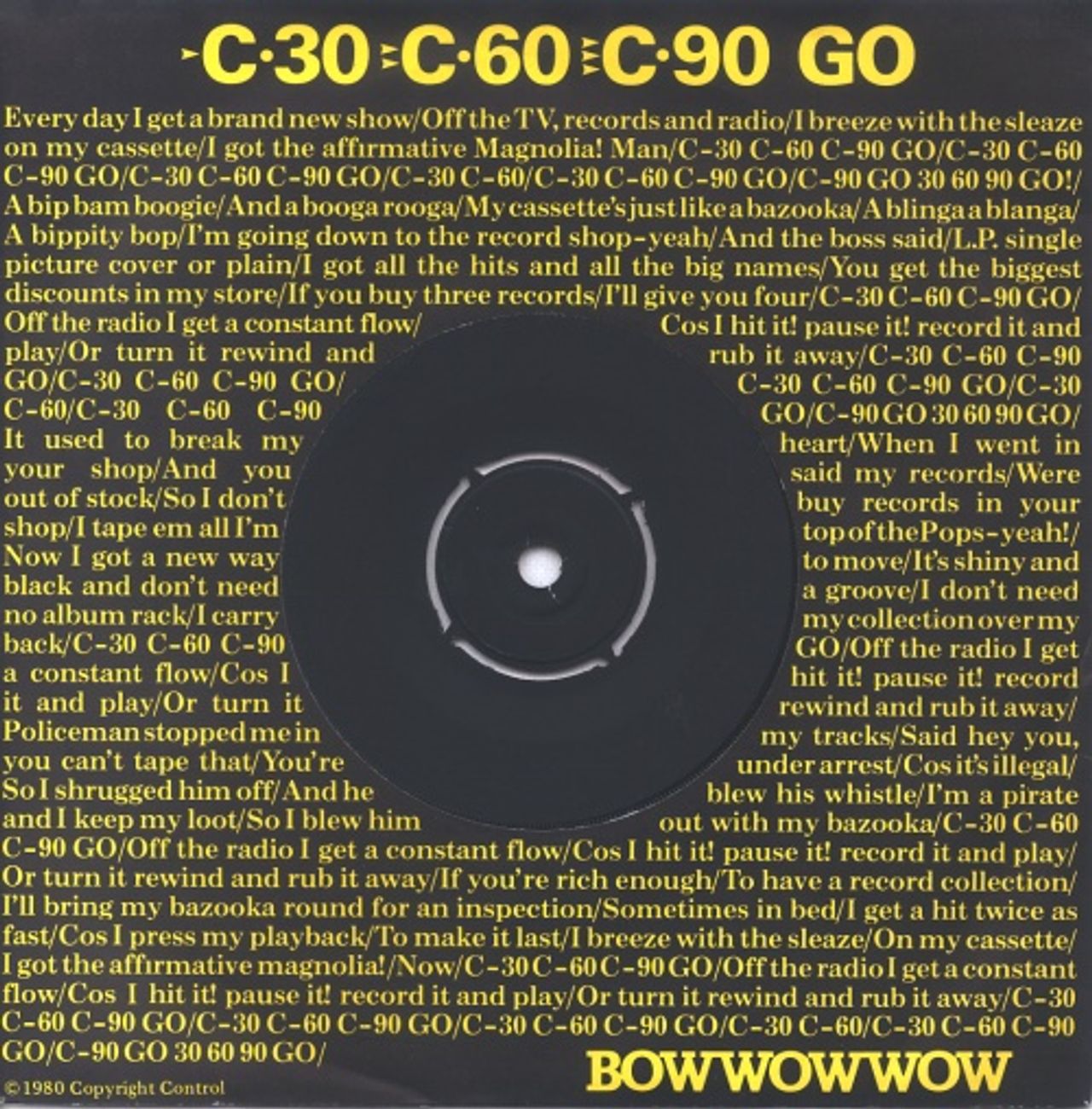 BOW WOW WOW C'30 C'60 C'90 Go (1980 UK 7" vinyl single with its intact four-prong centre, a classic debut '45 which extolled the virtues of home taping [controversial stuff in 1982!], also including Sun Sea & Piracy. Issued in the titled die-cutpaper sleeve, the vinyl remains in excellent condition EMI5088)