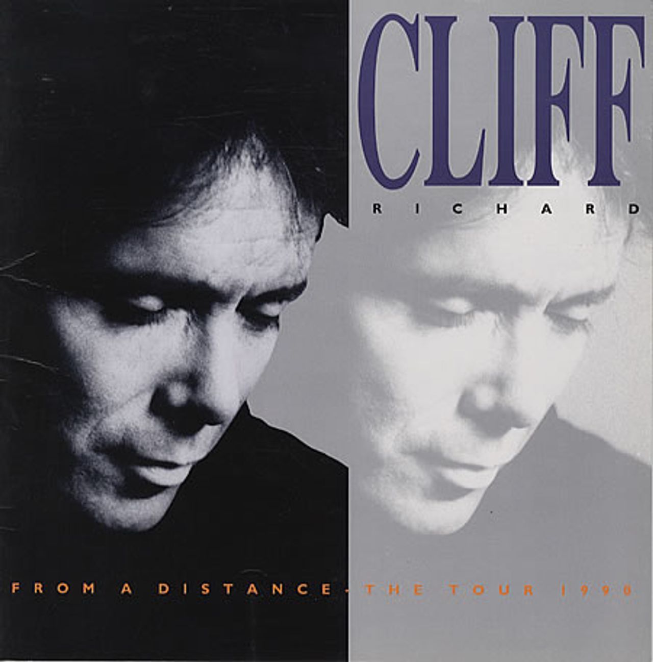 CLIFF RICHARD From A Distance Tour 1990 (Official 1990 UK 32-page tour programme featuring tour dates, a letter from Cliff & lots of live pictures. Great glossy cover which has only a few light storage marks otherwise superb with inner pages immaculate)