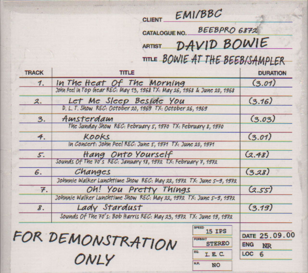 DAVID BOWIE Bowie At The Beeb/Sampler (Rare 2000 UK 8-track promotional-only picture CD sampler, including Let Me Sleep Beside You, Kooks, Changes and Lady Stardust, show reel image disc in custom white 'archive library' style card box designed to mimic the old reel-to-reel tape storage boxes with engineer notes handwritten on the front. This example remains sealed from hew. A cool collectable with the unique catalogue number BEEBPRO6872)